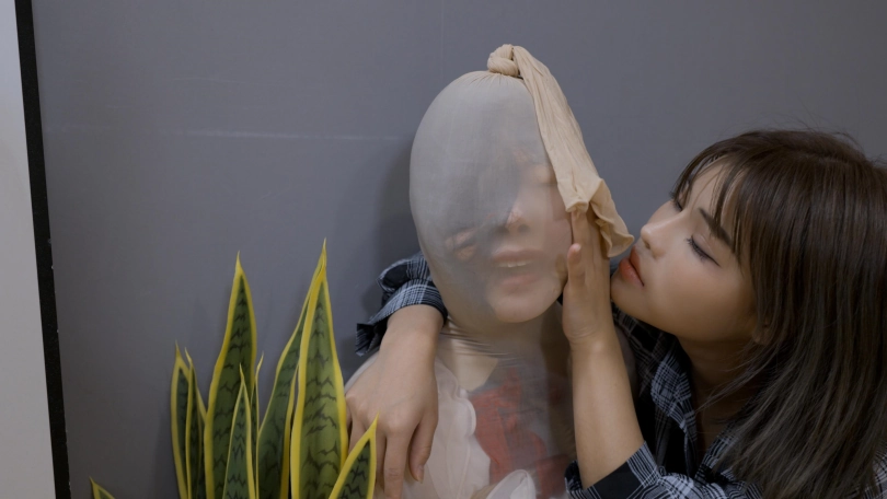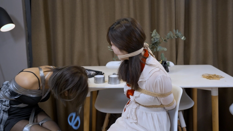 绑匪走之前留了一把剪刀给她俩,在争执谁先解开后,闺蜜选择帮助女主解开,女主被解开了之后,不仅没有解开闺蜜,反而加了一道股绳和胸缚,最后加上一层丝袜睡袋惩罚她。