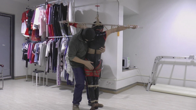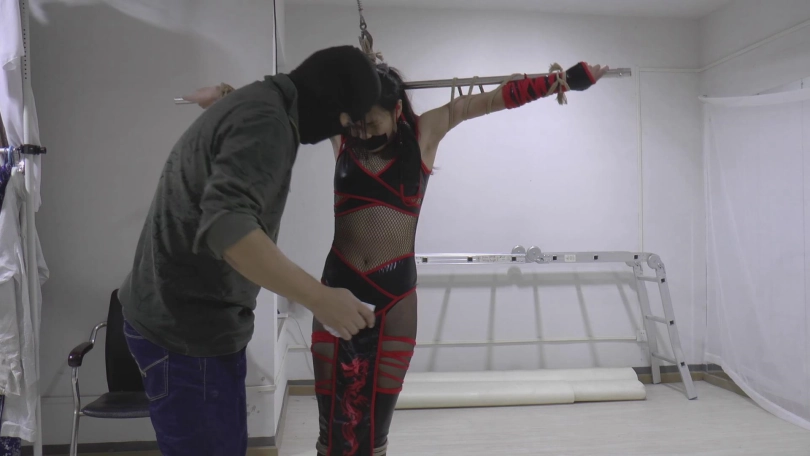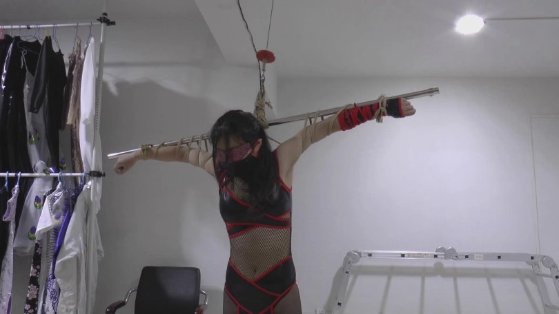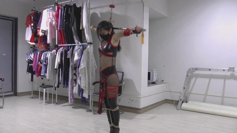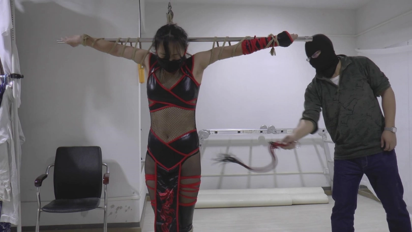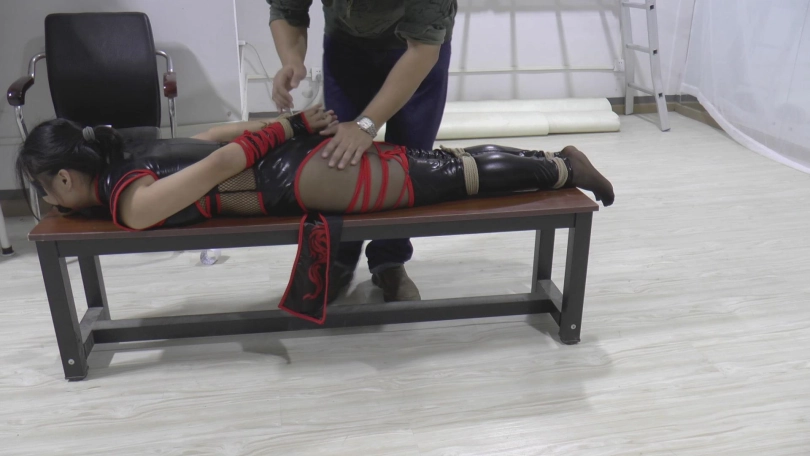 炸弹魔把女忍者四马攒蹄绑起来,然后蒙住眼睛,堵住嘴,炸弹也绑身上,然后就走了。