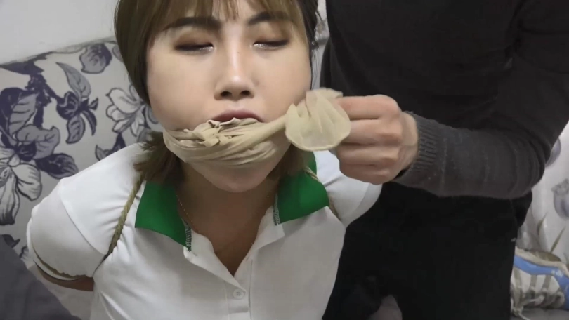 劫匪把阿琳捆得更紧,脱掉阿琳脚上的鞋子和穿的一双白色棉袜,取下阿琳嘴里肉色连裤丝袜,把这双原味棉袜强行塞入阿琳口中,塞得阿琳直恶心,翻白眼。