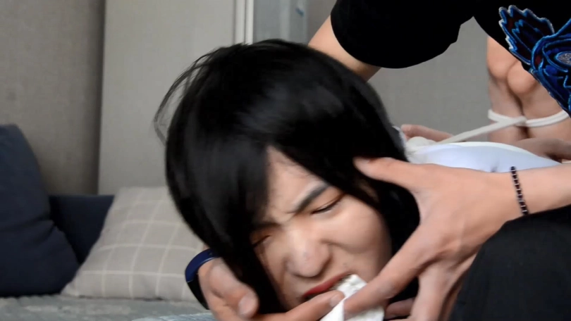 穿着白色锦纶丝袜的小楠坐在床上拼命挣扎,一度挣脱了手腕处的捆绳,试图用手指拽出口中的脏内裤,但被劫匪过来发现。