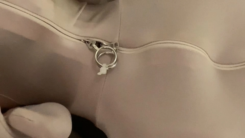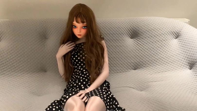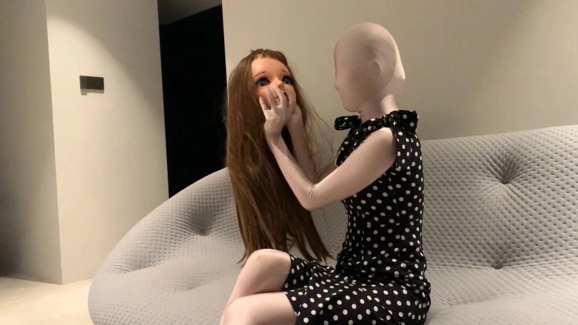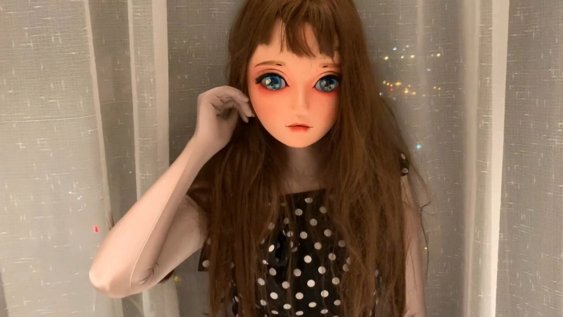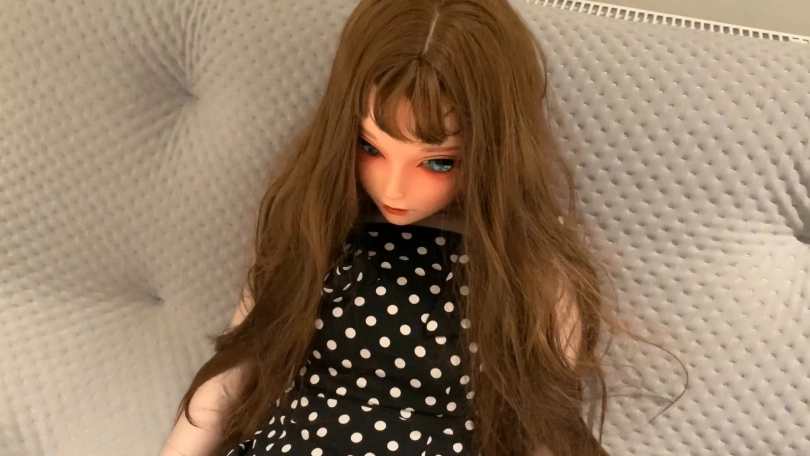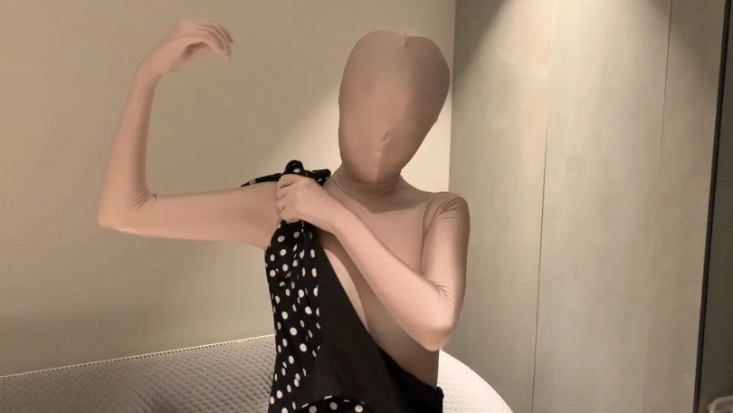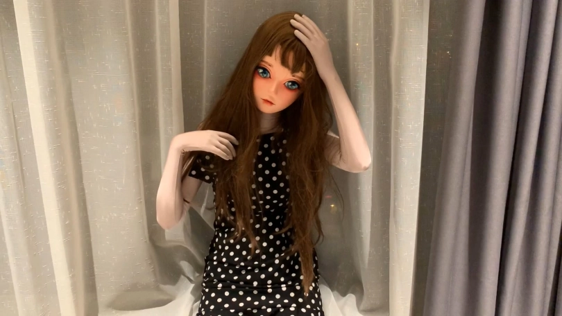 用扎带先把紧身衣的拉链锁起来,然后戴上头壳之后穿上高跟鞋和波点裙,做一晚上的乖娃娃