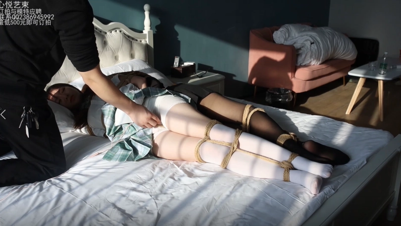 摄影师拿起手铐:“这个,谁要呀”悠悠:“我来吧”说着摄影师把悠悠的手,反铐在窗户栏杆上,随后,手铐钥匙放在电视上,开始捆绑婉儿,将婉儿绑成驷马,婉儿被绑住没法动:“帮我拉一下裙子,有点露”摄影师帮忙把裙子整理好,摆在悠悠脚边。开始返回捆绑林清脚,捆绑好以后,摄影师把婉儿手机放在脚右边1m左右,开始指导拍照,让悠悠双腿左右上下调整,摆比较性感姿势。