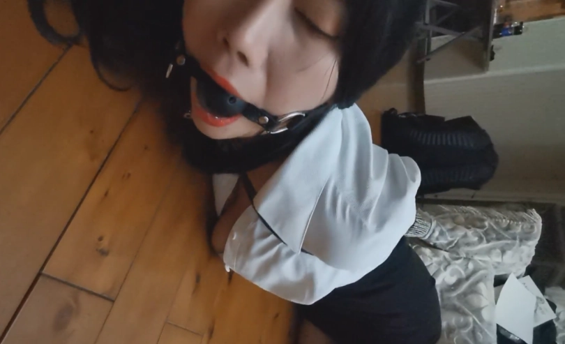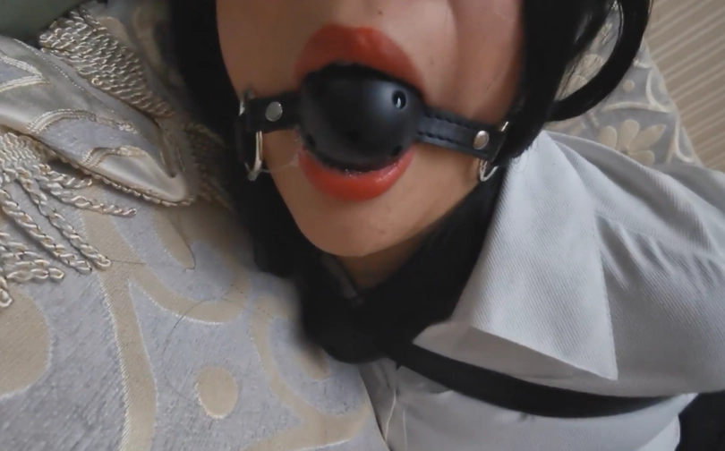 第二幕:小丁艰难的打量着自己。发现的双手双脚,分别被皮制的带子紧紧捆绑着。每一道捆绑带上,还被上着锁。与此同时,一根皮带穿过脚腕和手腕中间,把自己的身体绑成反弓状。这下,小丁活动的余地更小了。(画外音:到底是那个变态在玩这种捆绑游戏呀,绑松一点行吗,这个皮带,比绳子还难解开,皮带全部勒紧我的肉里面了,一阵阵的疼,幸好穿了丝袜,不然腿上勒出伤痕,明天都不知道出去见人)。见此状,小丁下意识想喊救命。发现自己嘴巴里含了一个球一样子的东西。(画外音:我嘴里是被绑了一个球吗?把我的嘴撑的好大,天啊…口水都咽不下去,快流出来了,好羞耻…。)这个时候,口水开始慢慢的从小丁口中不断的流了出来。