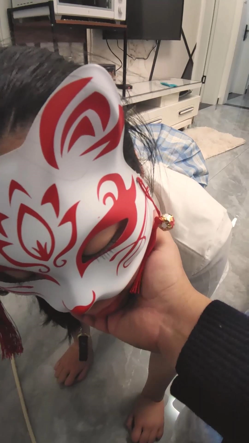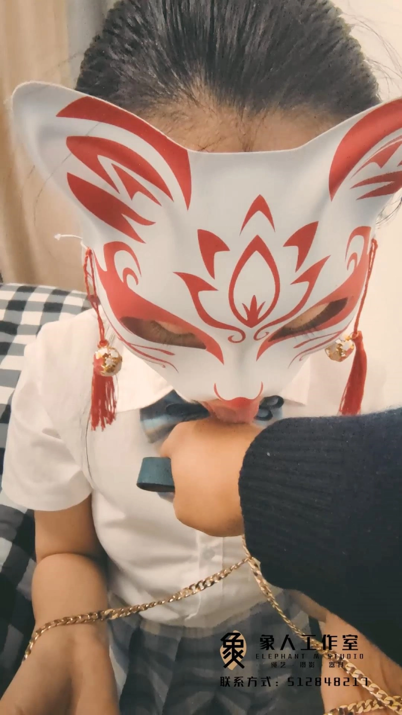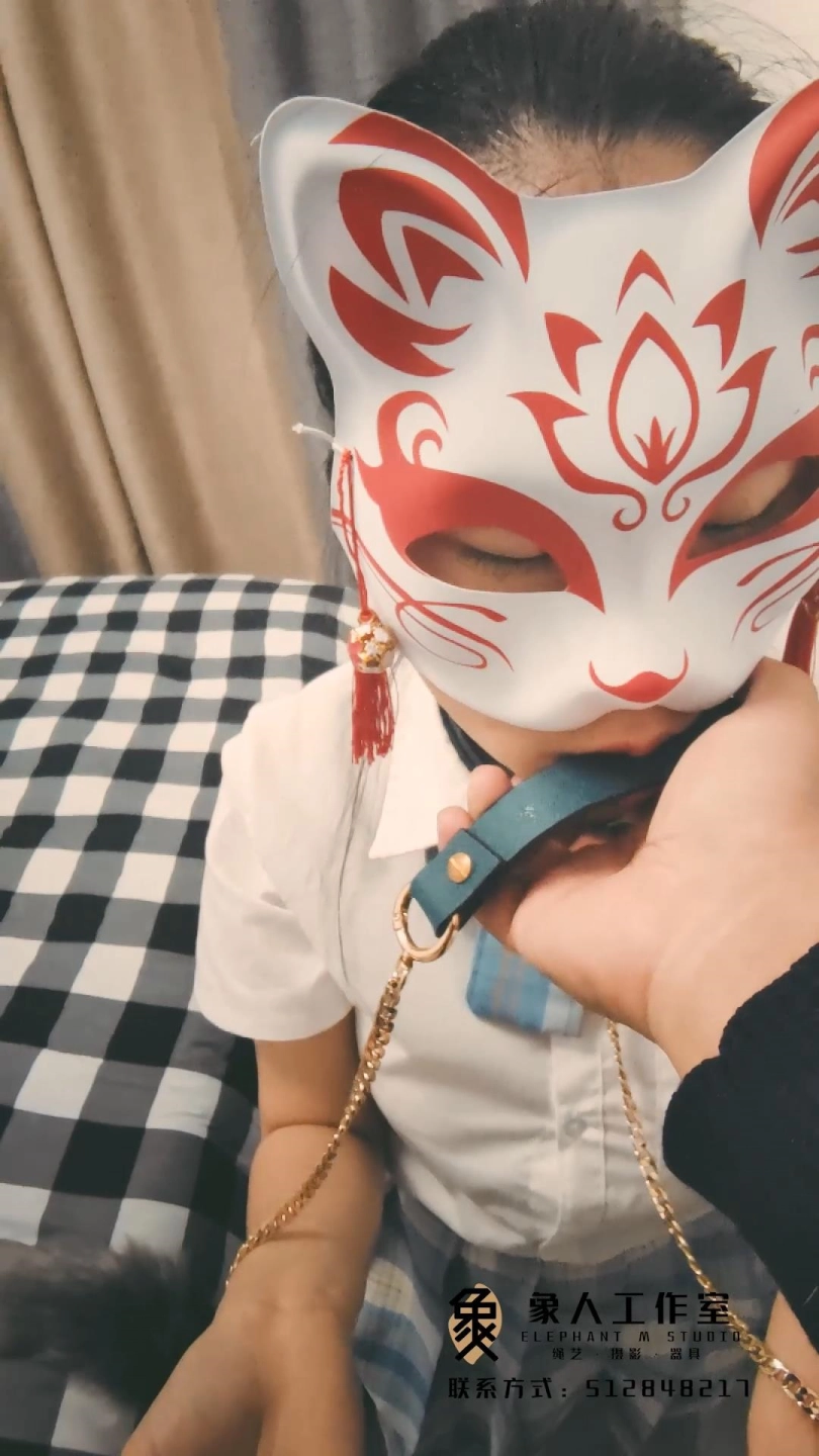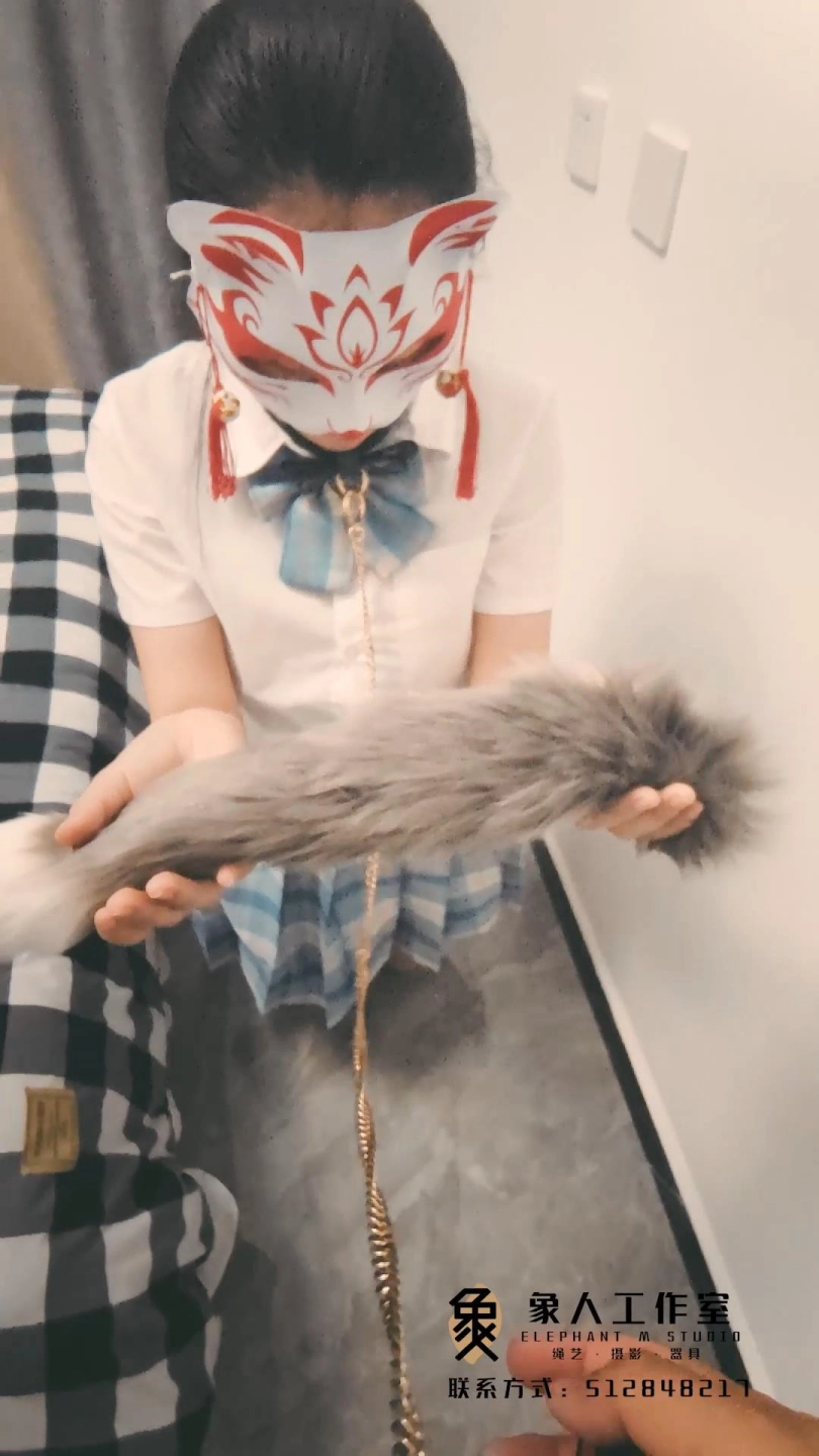 主人给小鹿拴上牵引绳,小鹿自觉的咬着尾巴放到主人手里,主人给小鹿戴上尾巴。脚踩在小鹿的头上,用藤条把玩下小鹿的尾巴。