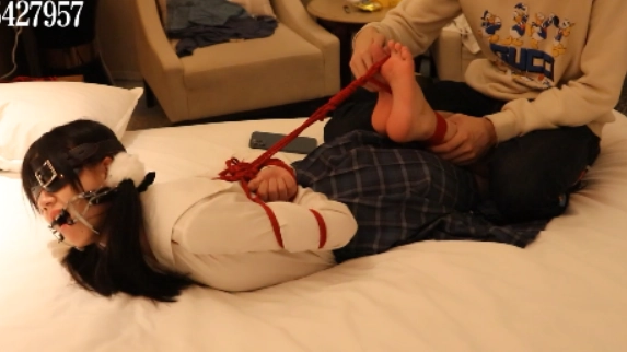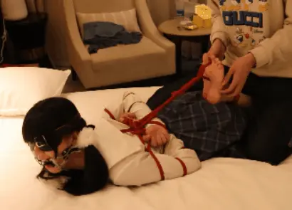 把茶茶五花大绑起来之后紧紧的来一个四马躜蹄,连茶茶可爱的小脚趾都不放过,一起紧紧绑住。