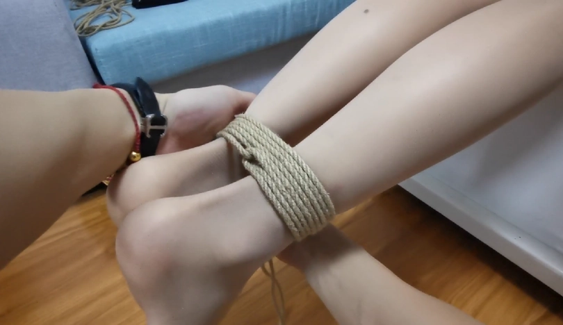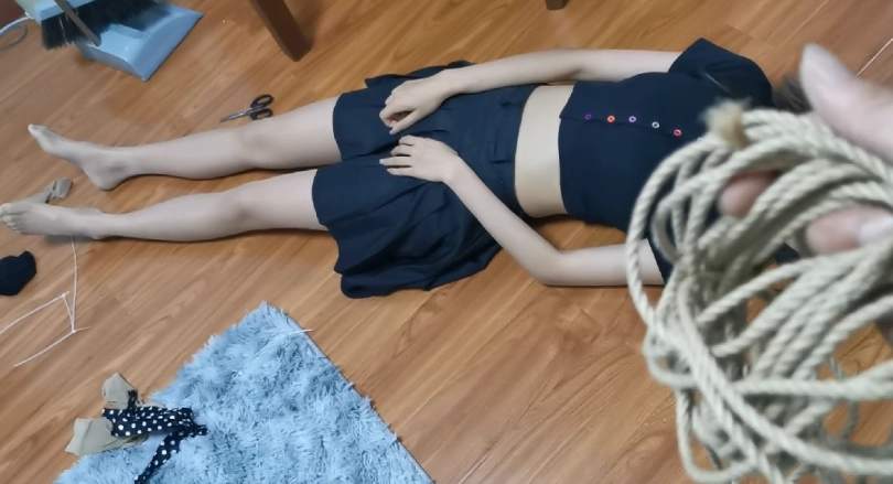 第三幕:小偷害怕珂如再次蹭断绳子,这次用了扎带。并且,用丝袜分别套住了珂如的手脚,心想,这下,你没办法蹭断了吧。谁知忘了拿走放在凳子上的剪刀。挣扎中的珂如发现剪刀后,趁小偷不注意,用脚拿到剪刀,剪开了捆绑自己的扎带。