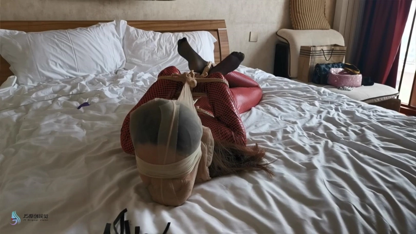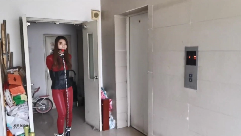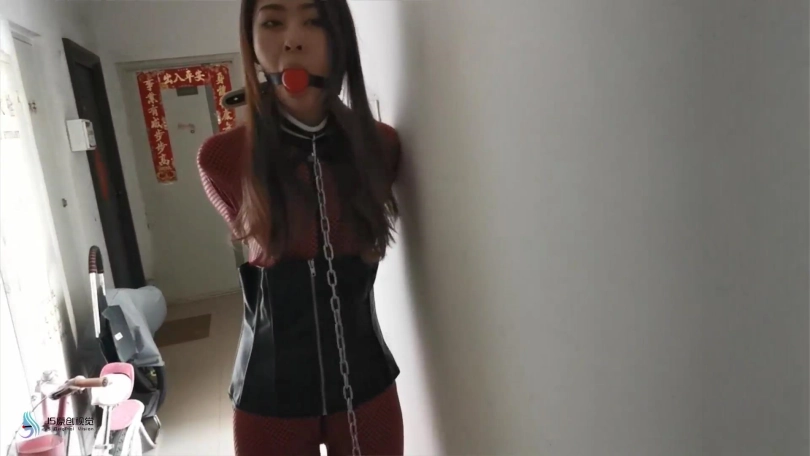 瑾萱穿着红色皮衣,手被单手套束缚,戴上口球,穿着高跟靴的脚也被镣铐铐住。鞋跟比较高,这让她每走一步都很艰难。抽打让她走到楼梯口,可能是她担心有人会过来,找了个借口便回到房间。坐在床上解开她身上的束缚,用[不可描述]棒刺激着她让她体验[不可描述],很快她便呻吟起来。接下来用绳子把她绑成驷马,嘴里塞着丝袜并用胶带封住,防止她吐出丝袜。再用一条丝袜套住她的头,蒙眼。无意中在她的袋子里发现了她穿了一天没洗的丝袜,正好派上用场。把丝袜揉成一团,放在她的面部,让袜尖部位,也是味道比较大的部位放在她的鼻子处。这味道威力还是蛮大的,刚放进去瑾萱就受不了,剧烈的挣扎着,嘴里含糊不清的出说“我不能呼吸了,这袜子太味了。”过了一会感觉她坚持不住了,便解开束缚,瑾萱也瘫在床上。