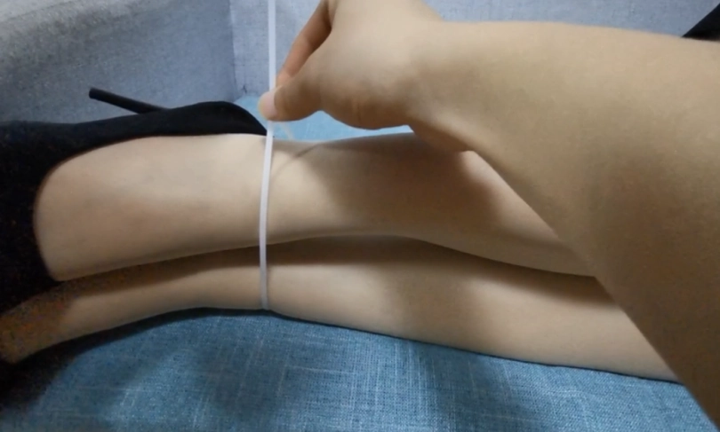 特特小心的把小丁老师的双腿并排放在一起,期间,还轻轻的用手抚摸着小丁腿上的丝袜。小丁还是一点知觉没有的,动也不动。特特开始缓慢的脱掉小丁脚上的高跟鞋~~。拿着扎带,套到她的双腿的脚踝上,一点一点的拉紧~~。