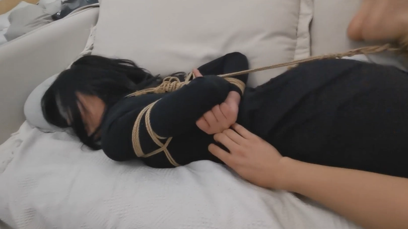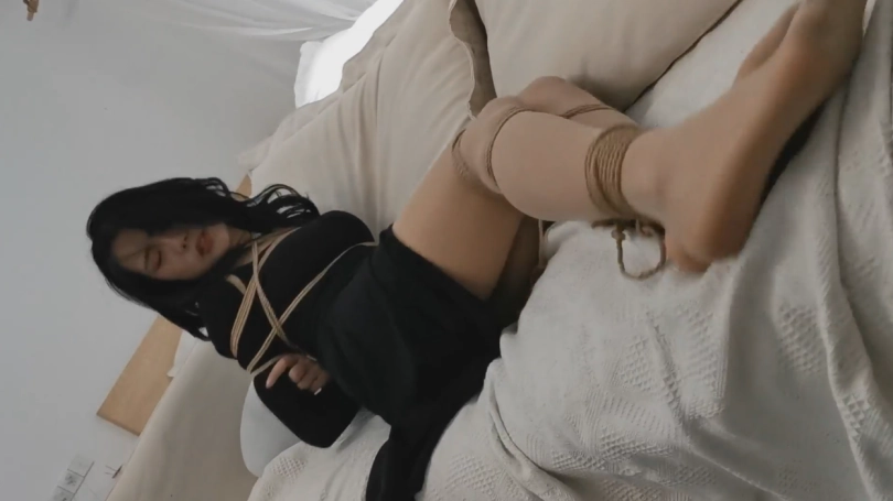 第二幕:若若坐到沙发上说:“我平时衣服比较多,所以绳子可能要结实一点。你这绳子质量怎么样?”(放心,我们公司的绳子质量绝对没问题,捆一头牛的都没问题,何况几件衣服)。若若:“真的假的?那你来把我的脚捆起来,我看我自己能不能挣脱”(暗自窃喜,没想到,卖个绳子,还有这种福利),我拿起绳子,走了过去…,因为怕勒疼她,我没绑的很紧,留了不少的空间,心里想着:这小美女看起来弱不禁风的,应该是挣脱不了的。捆好若若的双脚,若若尝试着挣扎了一下说到:“你确定你捆紧了嘛?我怎么感觉松松垮垮的”,说到这里,若若双手撑在沙发上,一用力,绳子就从她的脚上滑落了下来。“这就是你说的能捆一头牛,我这么轻松就解开了。这质量…”我瞬间一头黑线…,没想到这小美女,还是个练家子,似乎经常被绑的样子,轻敌了…。我慌忙解释道:我是怕勒疼小姐姐,故意绑的这么松的,和绳子的质量没啥关系。若若:“那既然这样的话,你在把我绑起来一次吧,把我的手和脚都捆起来。这次你可要捆紧一点。不用怕我疼,要是在被我解开了,我可不买你的绳子~”我心里暗喜:哼,偷偷躲在被窝里看绳艺的套路,今天终于派上用场了…,看我不把你绑的求生不得…。看着手中的绳子,脑海中浮现出若若被捆绑的样子。