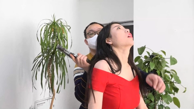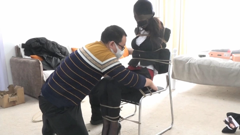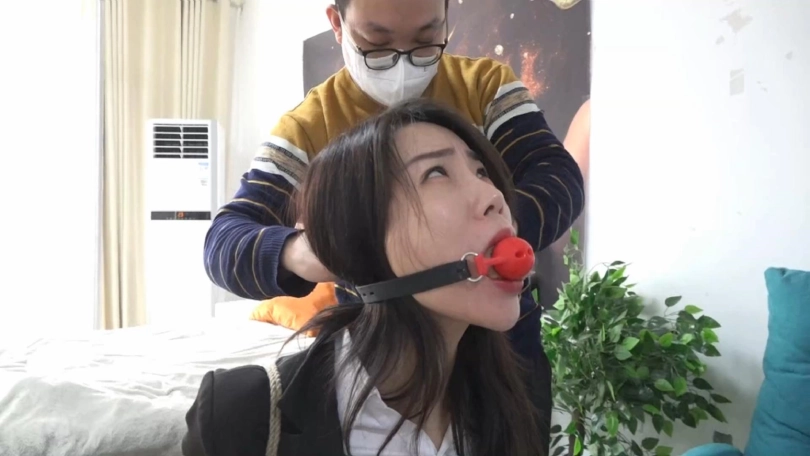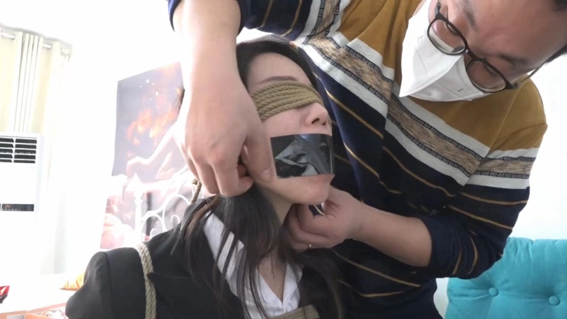 然后RF的嘴巴被塞进袜子,用胶带缠绕封嘴,她被男人扶到柱子边站好,男人用摄像机为她拍照,然后用卡尺为她量身高。