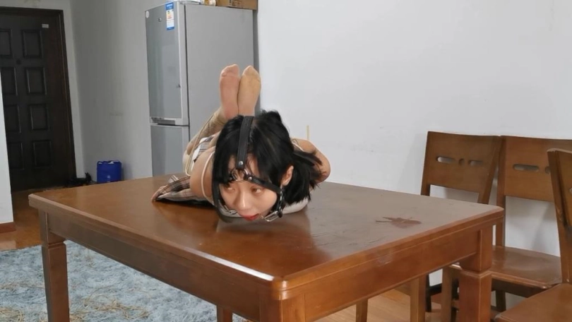 又是是身材凹凸有致的宝妹,把她极限直臂驷马紧缚放置在桌子上,在带上一个新买的马具型口环,再用绳子向后拉起来,这样宝妹就不得不保持一个难受的姿势一个人在房间里挣扎。口环相比较口球会使口水更快的流出来,不一会桌子上到处流的都是口水了,宝妹只能呜呜叫几声表示无用的抗议了。