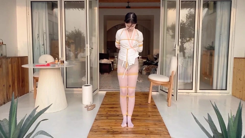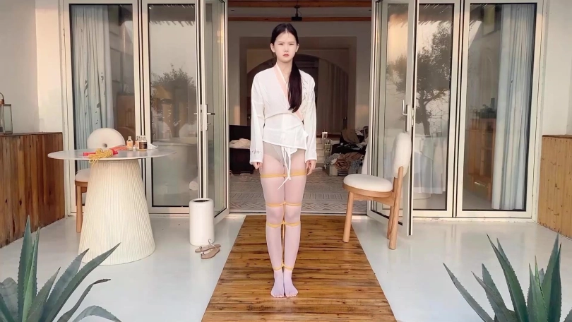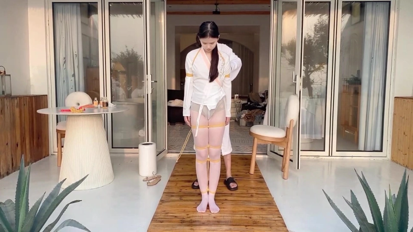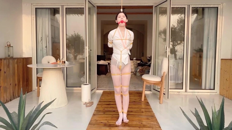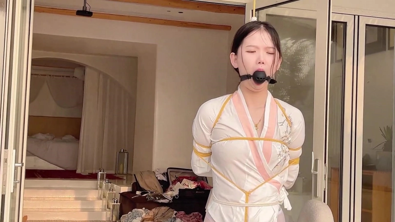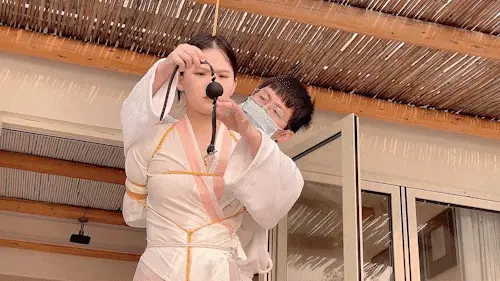 小夫妻海边民宿玩KB,老婆被吊在屋檐下,用最大号的球堵嘴,弄得嘴口水直流,老公还让她原地转圈。