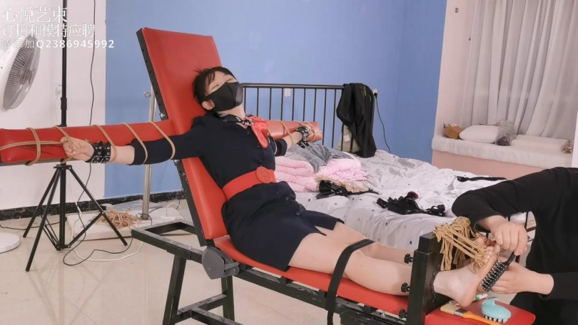 【心悦艺束】超性感的长腿裸足空姐被拘束在老虎凳上绑住十根脚趾戴上脚趾铐多种道具TK挠脚心