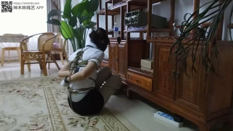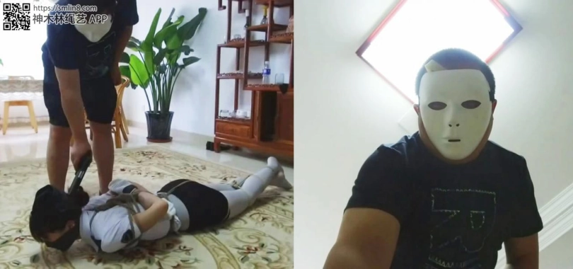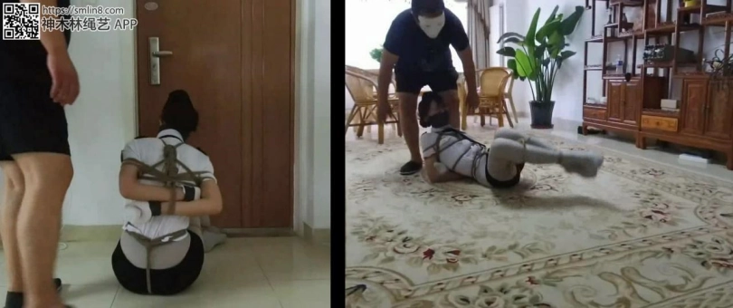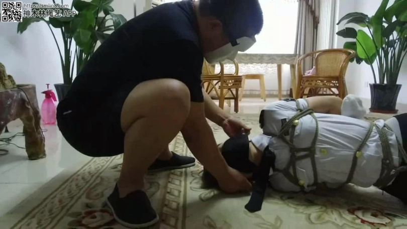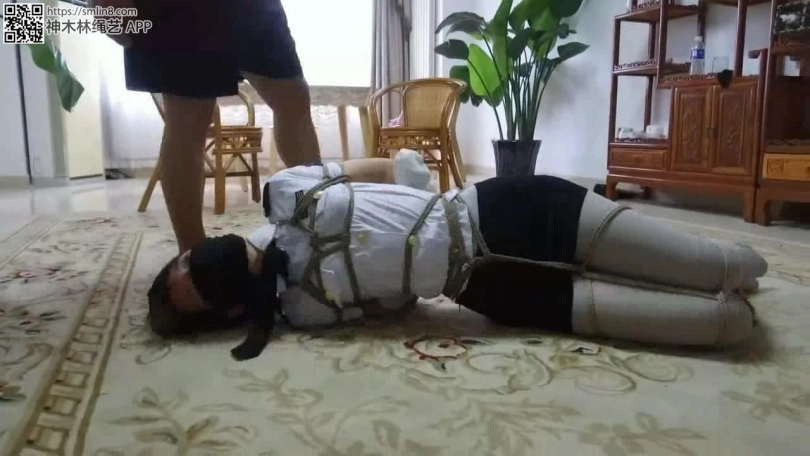 美女看男人走了,赶紧想办法挣脱,但她低估了匪徒的狡猾,她身上的绳索不仅牢固,而且她的手部还被套了厚袜子,袜口还被胶带封死,所以她根本无法解缚。