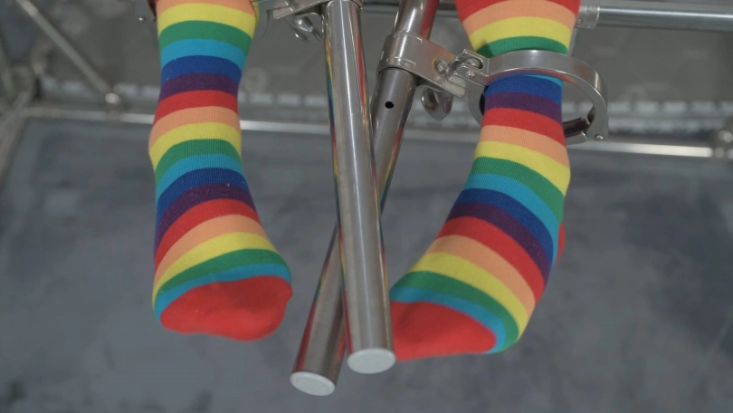 这个架子的设计可是花费了不少心思,重点是可以变换姿势,汤圆妹子体验的是分腿模式,先并腿方便TK,分开腿就是喜闻乐见的强高模式。这一次已经摸清了妹子的弱点和痒点,所以TK的反应比较大,时间也比较长,妹子不断扭动身体,抽动手臂,却被牢牢铐住。
