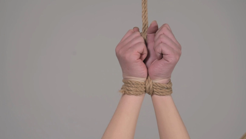 尝试了两个比较新颖的抱腿绑法,最后的跪缚固定缚,还出了一个比较有趣的小事故,绳师正玩TK玩得起劲,没想到汤圆反应这么大,猛地一台头,就听彭的一声!
