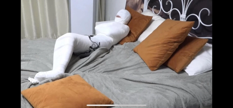 工作日的白天,白领赶回家里拿自己忘带的手机,刚打开卧室门发现屋内的东西被翻过,发觉不对劲想赶紧逃跑,却被带着面罩的歹徒从背后迷晕。白领从黑暗中醒来,发现自己被黑色胶带捆绑在床上,嘴巴也被胶带封着她无用得挣扎了一会儿,突然想起剪刀放在柜子里面,她挣扎着起身,警惕地看着卧室外面歹徒的动向,慢慢靠近柜子,挣扎着用双脚脱下高跟鞋,用脚勾出剪刀,挣开了束缚,白领小心翼翼地摸到门口,发现歹徒不在客厅赶紧跑,谁知和从厕所出来的没有带面罩的歹徒直接打了面照,歹徒下意识用手挡住脸却来不及,白领大声呼救,又被歹徒迷晕。歹徒喃喃自语到:“妈的,本来你安心呆着少点钱就没事儿了,看见我脸了算你倒霉。”歹徒将白领再次拖入房间,讲白领的手交叉放在胸前,掏出绷带……白领再次醒来,发现自己除了上半张脸和半个脚,身体全部被包裹,双手交叉放在胸前。