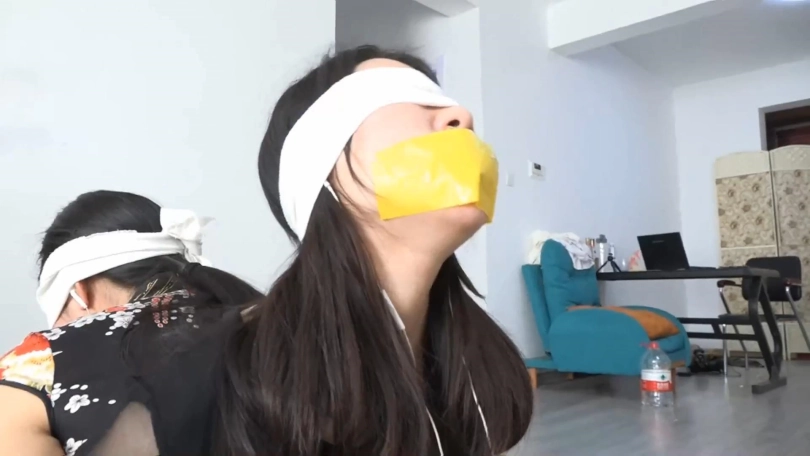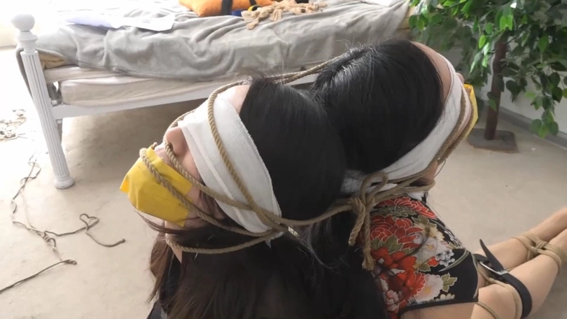 一番挣扎后,二人深知自己没有逃脱的希望,情绪都逐渐崩溃,使劲呻吟求救,随后因为催眠的缘故,两人在剧烈挣扎了1分多钟后逐渐都失去了意识。手下过来,她们将头靠在一起,用绳子缠绕2人的头。