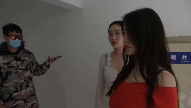 两人出门,在楼梯口处遇见了一个路人(带口罩墨镜)。