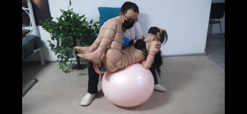技师正在尝试挣扎解脱身上的绳子,不过很快小偷就回来了。看到技师想解开身上的绳索不由得说:“想自己解开绳索啊,你是解不开的。”技师说:“大哥你不是去取钱了吗,可以把我放了吧。”小偷:“嗯,你很听话,我很喜欢,不过放了你也可以,在陪我玩会吧。”于是小偷将技师重新捆绑起来,抱着她躺在瑜伽球上,然后变换着各种姿势让技师坐在瑜伽球上。本来坐在球上是想用一根绳子吊着坐球上的,不过这个瑜伽球摇摇晃晃的,那样的话模特坐不稳的,就只好让男演员扶着坐着了~