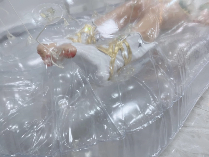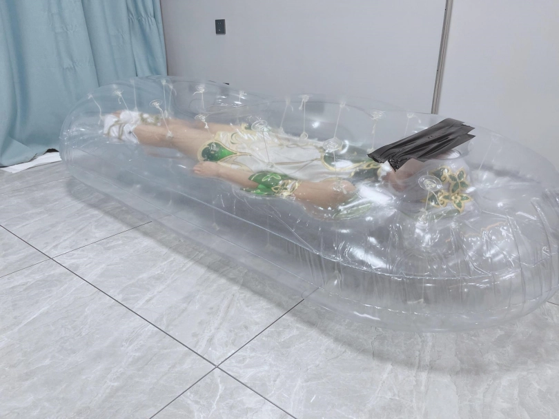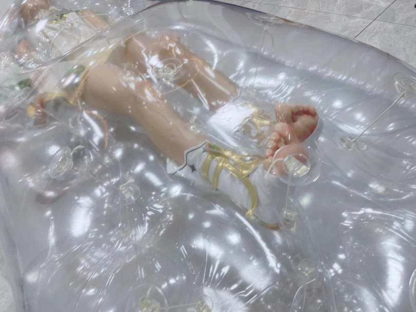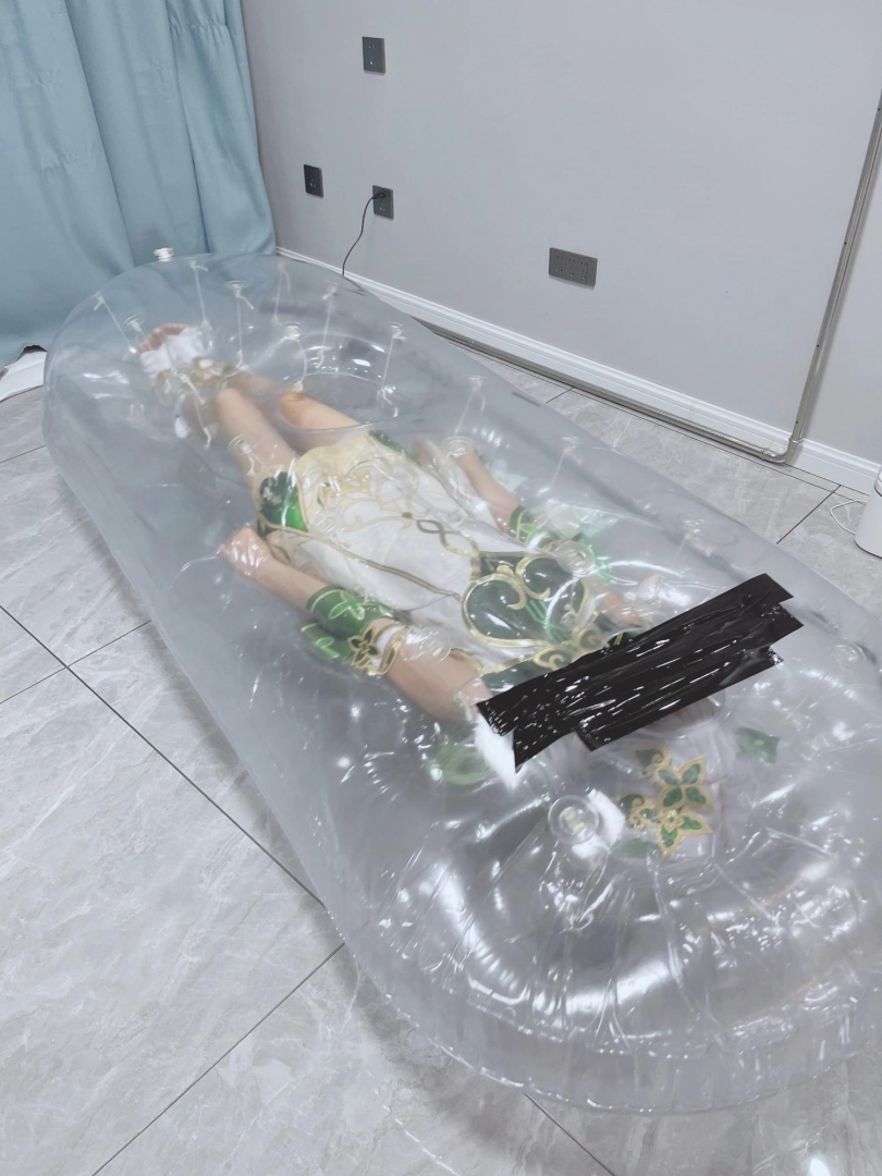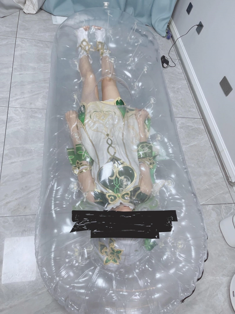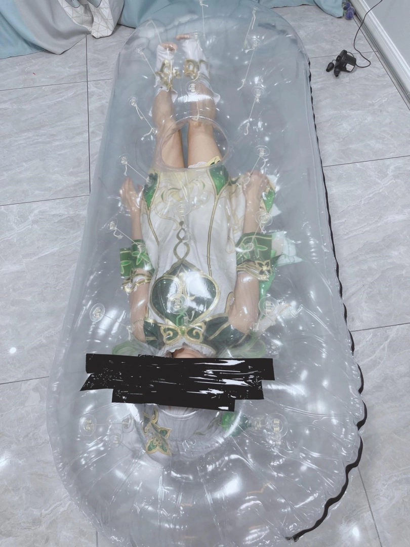 充气床的效果不用多说,一旦充满气就会被柔软的胶膜紧紧压住每一寸皮肤~连手指都动弹不得~(会发脚趾被压住的特写),被封印在里面的填充物只能像秋千一样带动着充气床整体轻微摇晃~