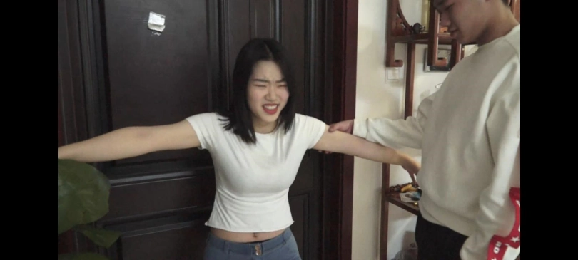 佳杰回到家里,可是突然有人进来点住他的穴道,女主便问是谁,可是神秘人就一直摆弄她身体,让她把银行密码说出来,佳杰不说然后点了她的笑穴,于是佳杰便笑个不停,忍不住将密码告诉他,然后劫匪将她放在沙发上便走了,可是一会又回来了,一直抚摸她的身体,又把袜子脱下来玩,玩的差不多把她腿抬起来让她保持住这个姿势,神秘人说我就是喜欢看你这样,男主趁女主得意之际把穴道解开,又把她定住,让女主换了身衣服摆出几个很性感的姿势,并且抚摸她的身体,然后将她放到床上你懂的,完事又将她定住,男主把她定住没有准备解开便把她放置在这,可怜的女主就这样定在这。