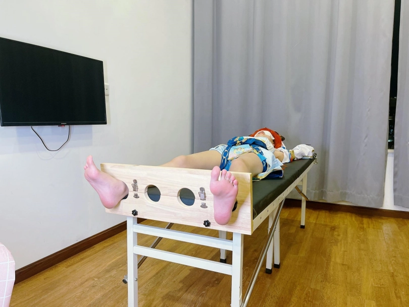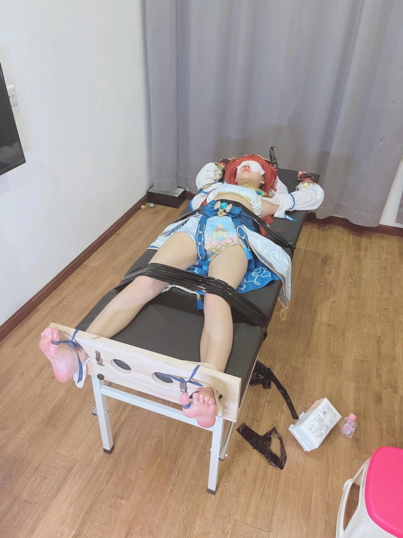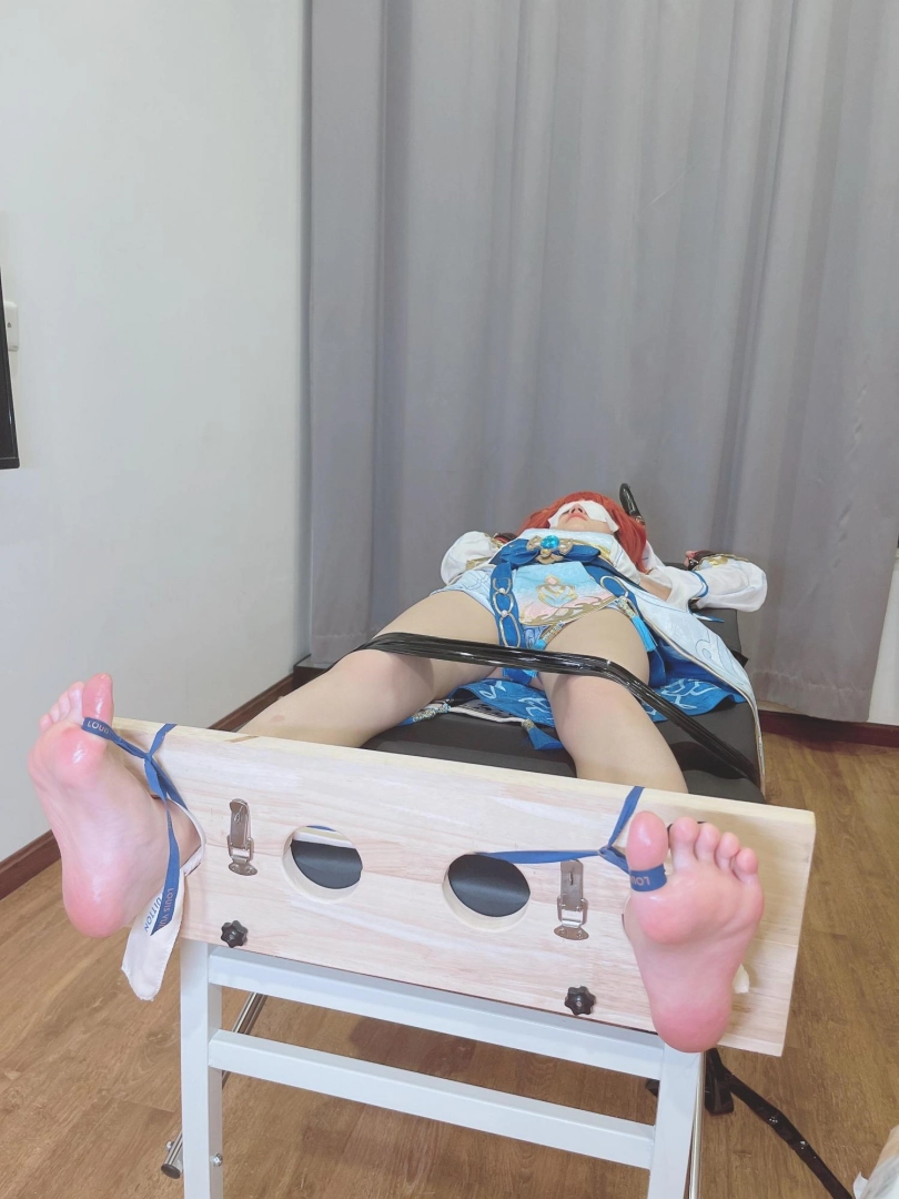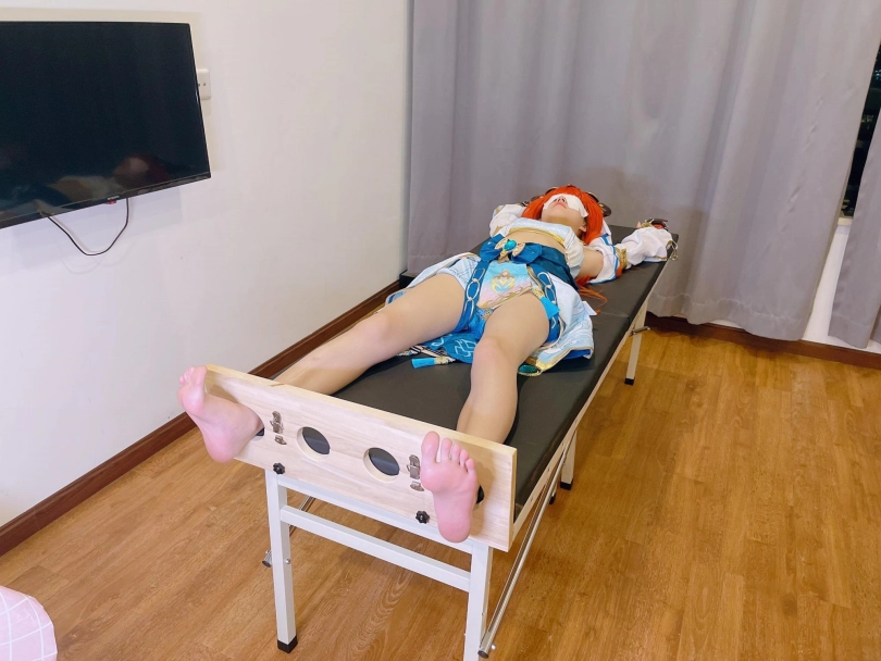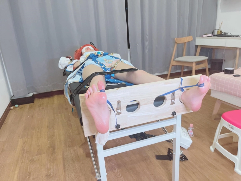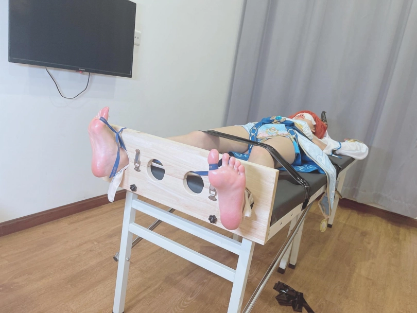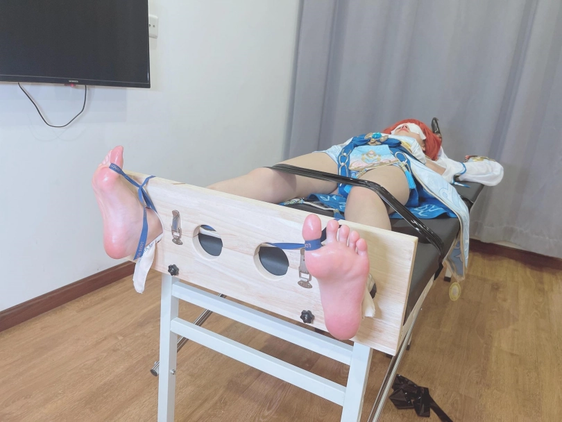 她知道,这次痒刑不会那么简单,因为身边提高敏感度的精油、高强度电击拍、刺轮等挠痒道具应有尽有。与之对应的,她的双手被迫铐在脑袋上方,粉红色的小脚丫也固定在足枷里。