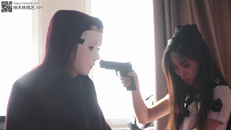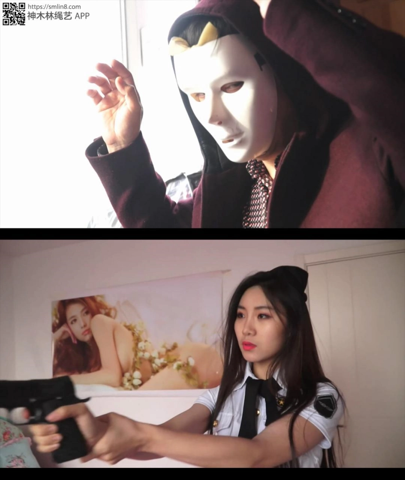 女警挣扎一会,发现根本没用,于是她艰难的蠕动到门口,想逃出去。