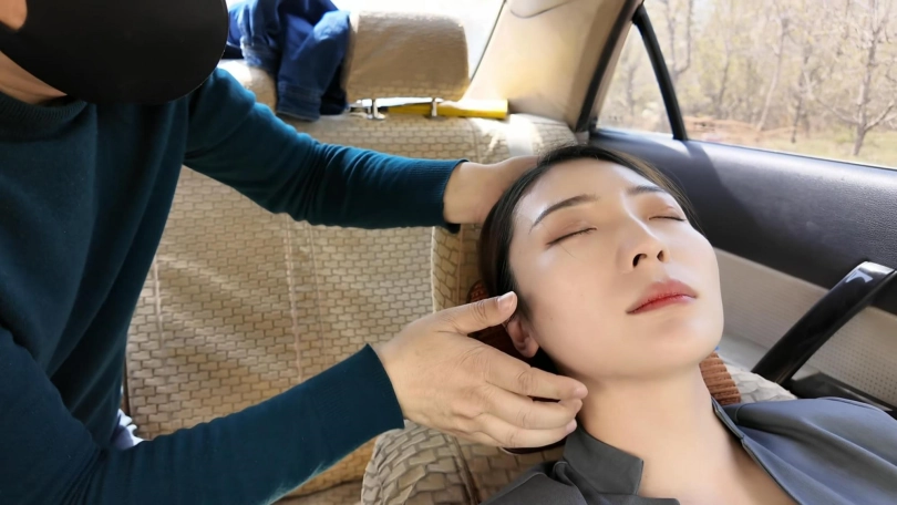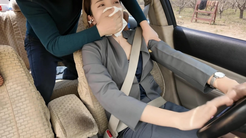 女经理边打电话边上车,没想到车上遭已经藏了一个歹徒,歹徒趁女经理发动车的时候用毛巾捂晕她,脱掉的衣服,开始玩弄,最后把她拷在车的方向盘上