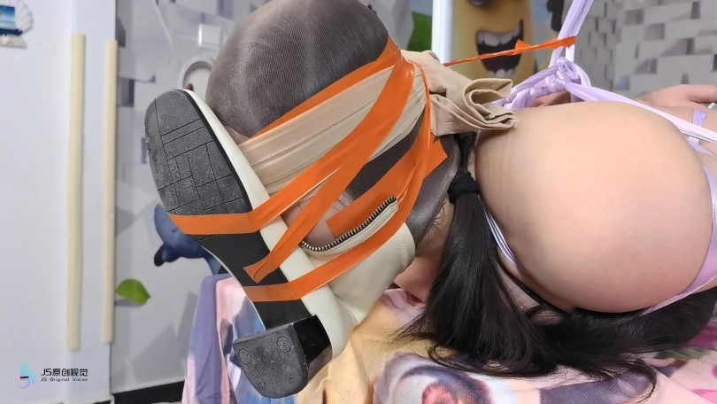 女人被脱去外套,被丝绸驷马捆绑在桌子上。男人将她的棉袜脱下,一只塞进她的嘴里,再套上丝袜头套,外面用胶带缠绕放置她吐出袜子。男人贪婪的亲吻玩弄着女人的丝袜双脚。在她的下面放着棒棒刺激着女人。男人将另外一只棉袜塞进一只靴子里,然后放在女人的鼻子上固定好。让女人闻着自己臭袜子和靴子的味道,享受着棒棒刺激带来的快感。