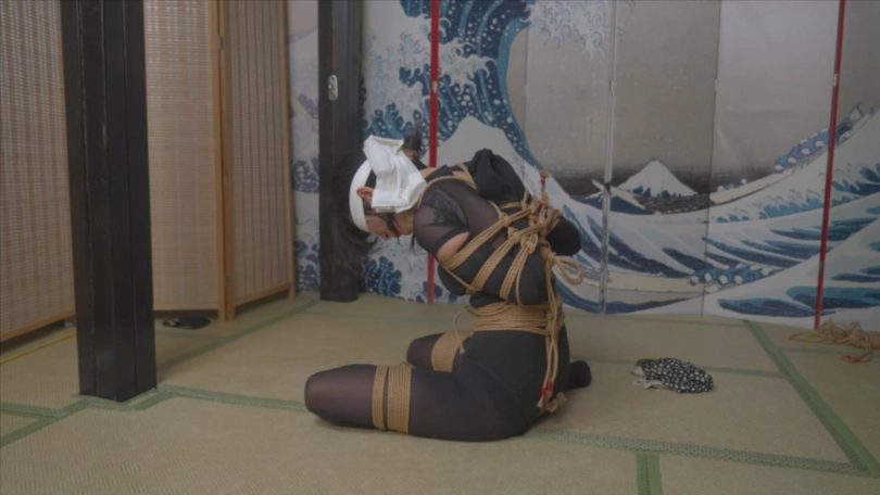 她穿着的那件黑色舞蹈服,其实是“连体”与“分割”之间的暧昧物:高领、无袖,面料从锁骨一路覆到脚背,像第二层被染黑的肌肤;可又在关键处留下隐秘的缺口——脊骨中央,一条不足两指宽的开口,被三对细若发丝的黑色松紧带交叉穿过,像极简的“绳缚”预演,每一次呼吸都让带子微陷进肉里,留下淡红的暂时性花纹。排练厅的灯光冷白,她先盘膝坐在地板中央,自己把第四根松紧带绕过胸口,再斜斜压到对侧腰窝,打成一个只有舞者才熟悉的“内缚”结:不追求痛感,只为把肩胛骨强行拉向脊柱,让双臂在背后的角度永远保持“即将振翅”的折线。黑色布料因此出现额外的张力,像水面被暗流勒出看不见的沟槽。音乐起,她起身,那根临时加上的“绳”并未解开,反而成为动作的隐形轴心。每当她小跳,松紧带便稍许深入,像有人从背后轻扣她的肋骨;旋转时,交叉的带子在皮肤上滑动,摩擦出细小的热,顺着脊沟一路淌到腰眼,被舞服的外层迅速吸走,却仍留下微辣的触觉记忆。她做“后踢紫金冠”——右腿后撩至耳侧,胸腰反弓,双手被迫因“绳”的牵制而只能停在半空,肘部折成黑色闪电。那一瞬,衣料与松紧同时发出极轻的“嘣”声,仿佛夜色里弓弦震颤,观者的心脏也跟着被勒紧一秒。落地后,她顺势俯身,把缚在背后的结悄悄松了一格,让血液重新灌回肩胛,皮肤表面浮起细碎的麻,像黑夜里悄悄开又谢的火花。镜面墙里,她的影子被那根看不见的“绳”复制成双重:一个她正在舞蹈,另一个她被自己缚住;两条黑影时而重叠,时而撕裂,像一场无声的辩驳——究竟是谁囚禁了谁?最后一个旋转,她突然把双臂从自制的缚结里滑脱,松紧带瞬间弹回衣内,脊骨中央的开口重新合拢,像刀口被黑线缝合。她站定,汗珠沿颈侧滚到锁骨窝,被高领的布料一口饮尽;而那三对细松紧带,仍在衣下轻轻颤动,仿佛尚未甘心松开,仍在等待下一次,把她重新绑进更深的黑夜。