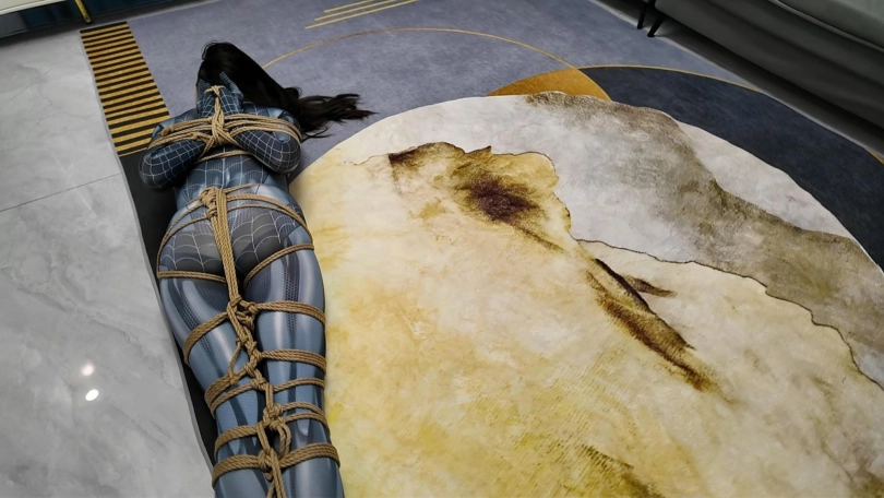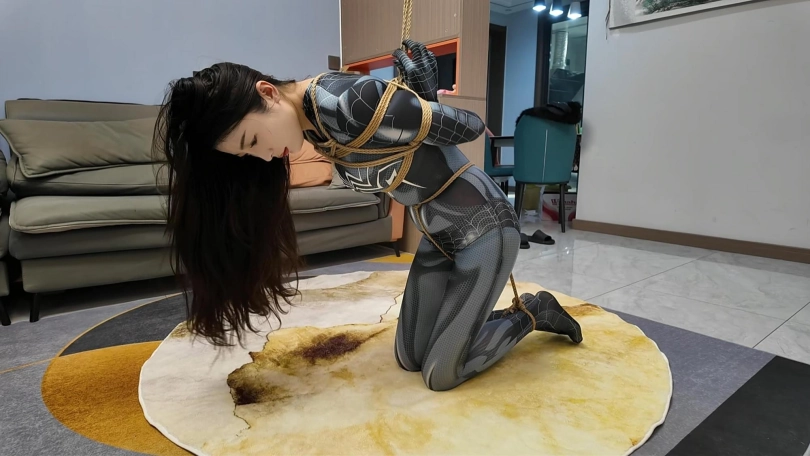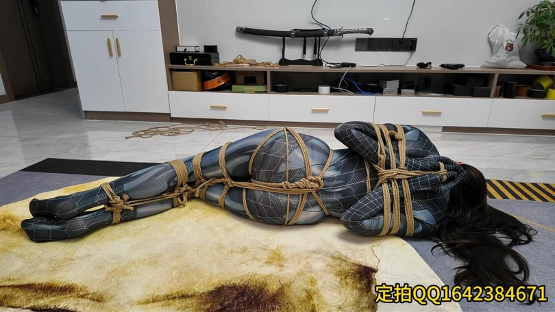 女蜘蛛潜入房间搜查,被抓获捆绑,股绳套在双脚上,一动就会扯动股绳,上半身吊起,这个姿势还是很难受的,并且会紧紧勒着下面,刺激着下面,接下来后手观音驷马更是加大难度,这个女蜘蛛被束缚的可惨了.
