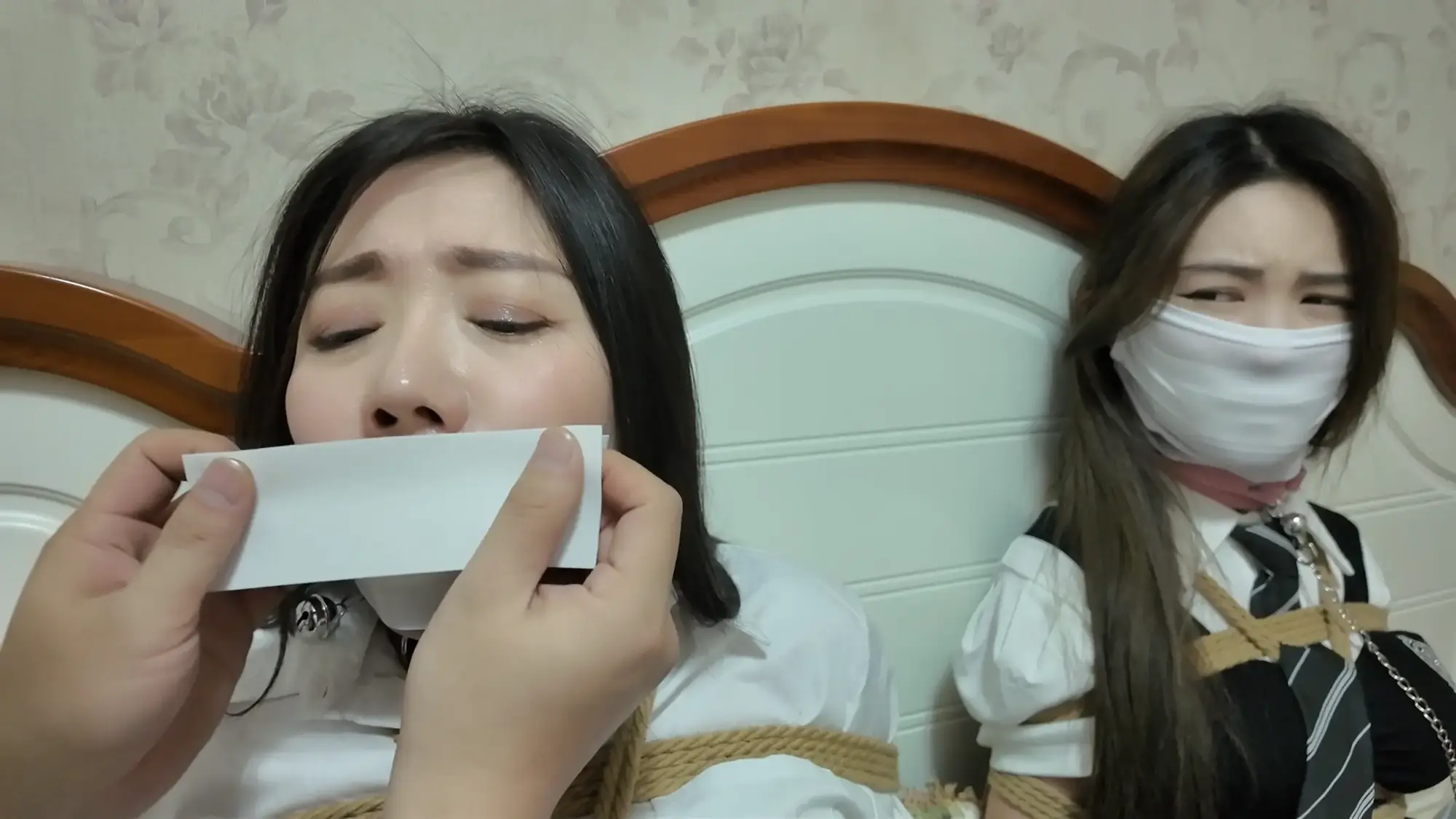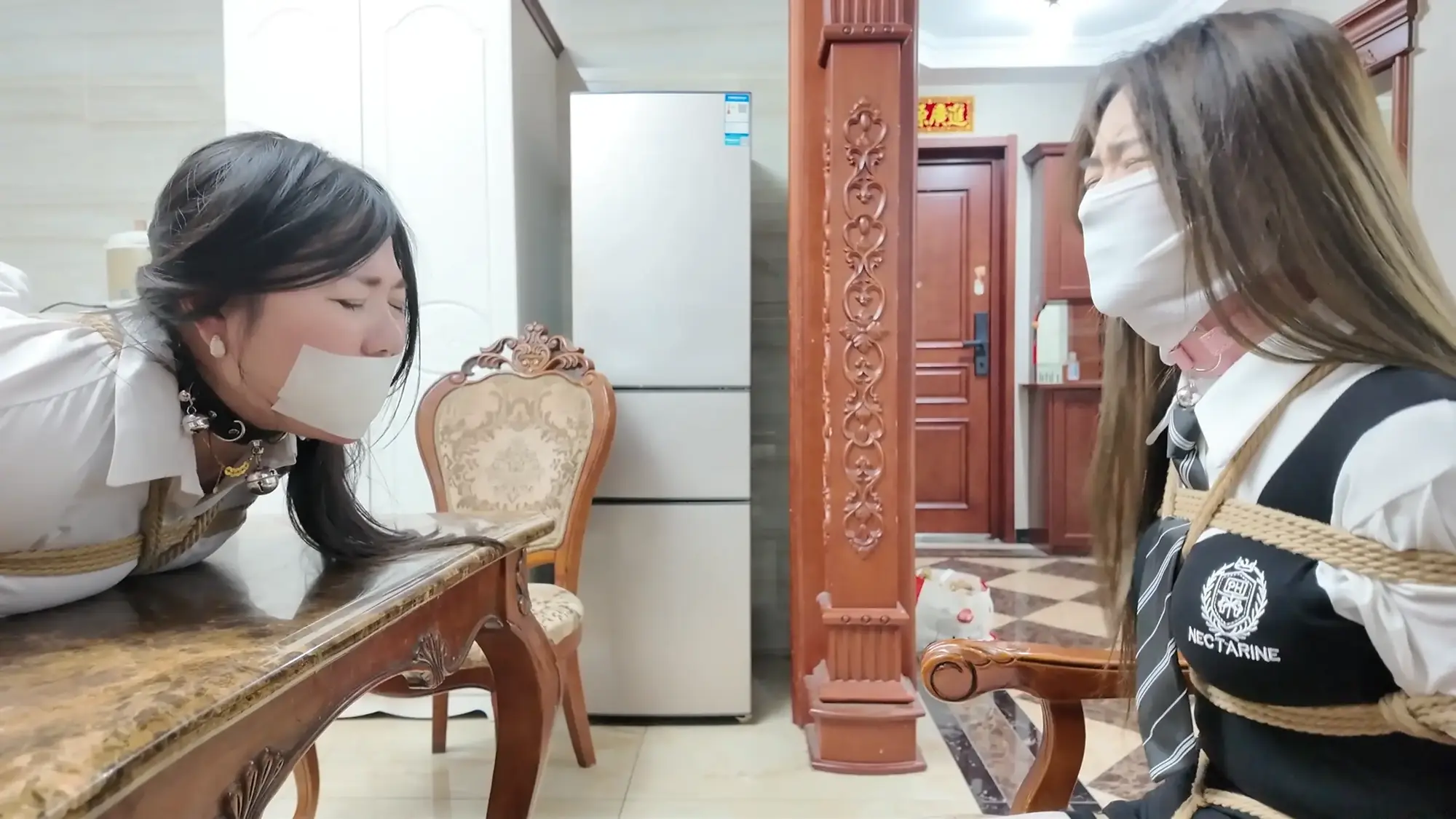 但柴哥可不会因为她们的摇尾乞怜而放过她们,两人被强行牵着蹦跳着坐到了椅子上,