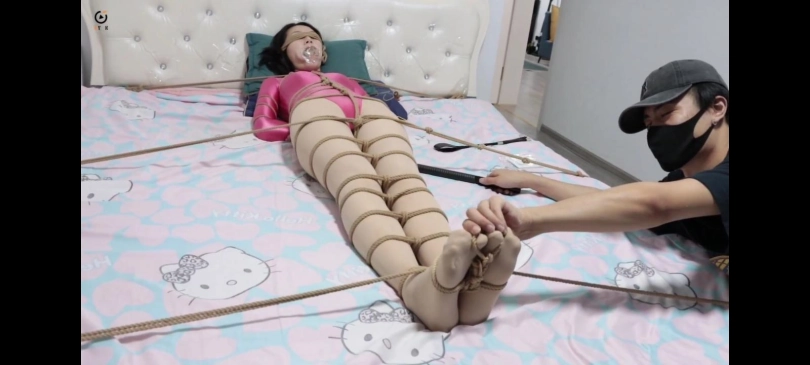 模特沈抒。接上集小刘让女友躺到健身器材上开始捆绑上半身胸缚,然后再绑到上面脖子也缠上几圈。腿和脚也拿绳子绑起来,(用漏眼口球戴上攒口水。绑完后便开始挠痒和用情趣鞭子打她,女友发出呜呜的声音。拿出小刷子继续挠脚心挠个几分钟。玩偶女友大笑不止,男主将健身器放平,口水便都进入她的嘴中,男主:怎么样啊好喝吗,女友乖乖点头,男主:让你玩点刺激的随后拿来电击棒)电击她的屁股胸部和脖子。并且男主拿出遥控器点了失禁状态,并且拿来充气口塞将她嘴充到最大,将内部震动状态开启到最大,女友难受的呜呜的叫着,坚持不住便失禁了。男主:刺激吧,继续享受吧,新一轮折磨开始。绑在床上,男主躺在床上抚摸着她,女友也表现出很享受的样子,男主给她戴上扩口器,将她嘴里用丝袜塞满拿胶带堵好,绑好后继续抚摸挠痒她,用绳子把眼睛缠住。然后便又开始一轮挠痒电击,女友只能一直挣扎叫个不停,看着她的脚于是将大母脚趾绑起来,并且疯狂挠她的脚心挠个几分钟,还伴随鞭打和电击棒的折磨电击时演出那种被电的感觉,然后开启[X_X]模式,演出那种喘不上气的感觉,玩偶女友也累的坚持不住,男主便开启石化僵硬模式,玩偶女友便像雕塑一样瞬间僵硬,完全无法动弹无论男主怎样抚摸挠痒都没有感觉,好了,我要抱着你休息了男主抱着自己的女友心满意足的睡着了。