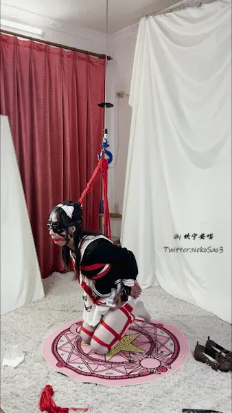 继续自缚~依旧是熟悉的胯吊+上身吊+后手直臂,腿部选用了折腿,然后用绳子拉住马具口球强迫抬头,服装换成了lolita+白丝裤袜