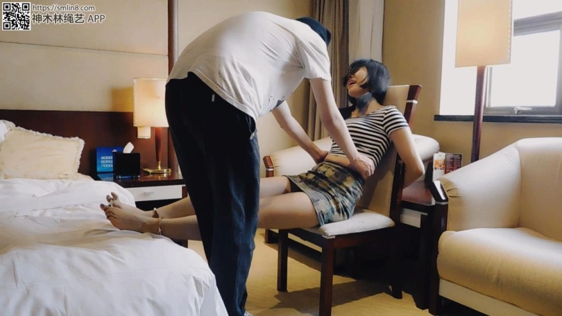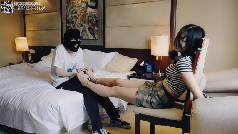 妹子在屋里无聊中,然后坏人突然出现,把她弄到椅子上,手背后锁住,脱下鞋袜,脚趾脚腕锁住,挠脚心。之后换个角度。全程都在挠脚心喔。