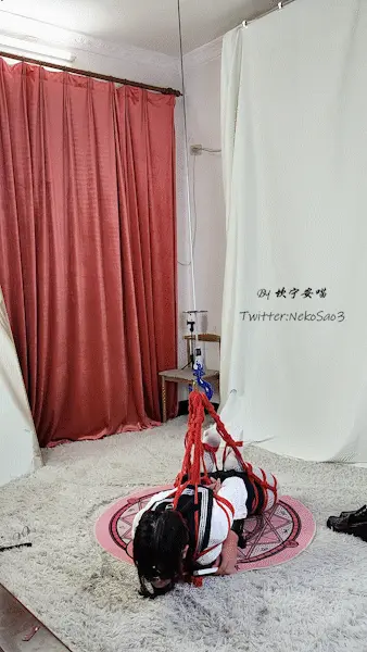 继续自缚——这回是折腿吊的进阶版——折腿驷马~~不得不承认这个姿势靠自缚雀食是有点累,很多理应很好走的绳路以被缚的第一视角来看完全不是一回事,更何况还是在身体已经被部分固定的情况下……不过最后好在是勉强完成了。