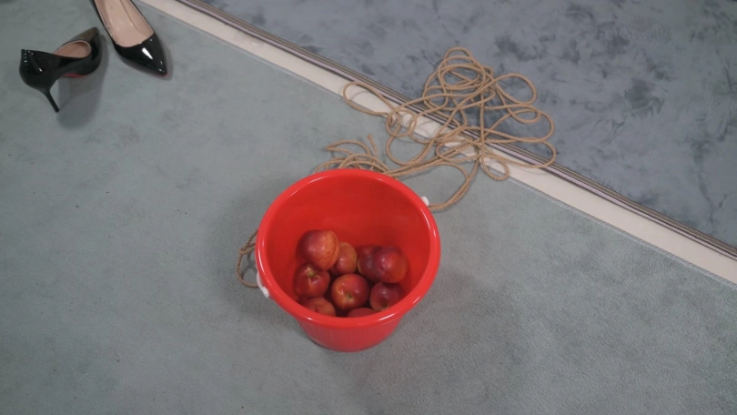 上一次的水桶刑罚给妹子上了深深一课,这一次妹子本着好了伤疤忘了疼的精神再来一课。没想到这次绳师把水换成了水果,差不多的重量,但是绳师先是轻轻放入,然后逐渐增大距离,把水果扔进桶里,这样一来,每一次砸击可是要增大加倍的重力,最后还不过瘾,把一双高跟鞋也扔了进去,每次扔进桶里之前还故意让妹子看一看,妹子心理阴影面积得有多大!