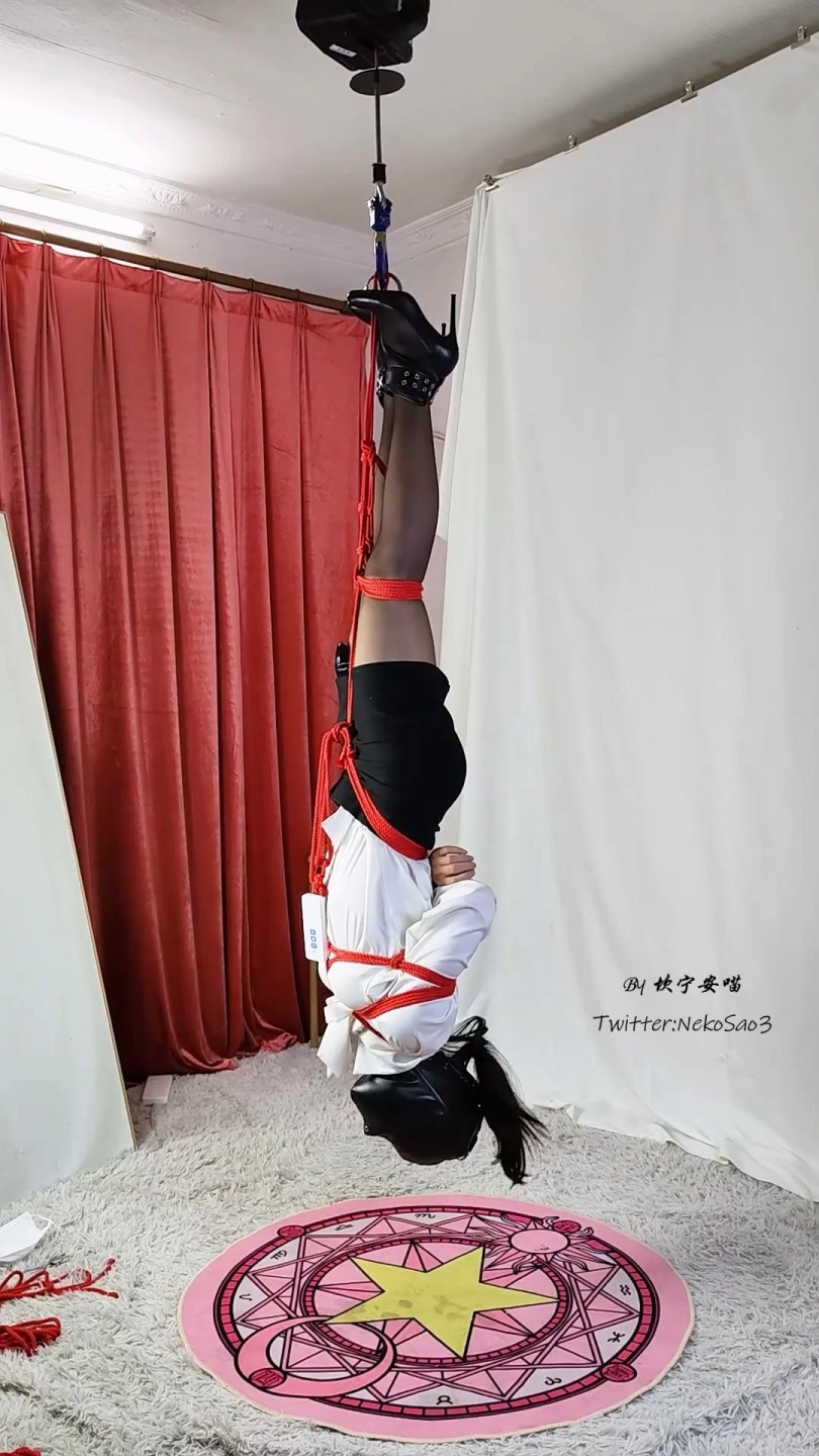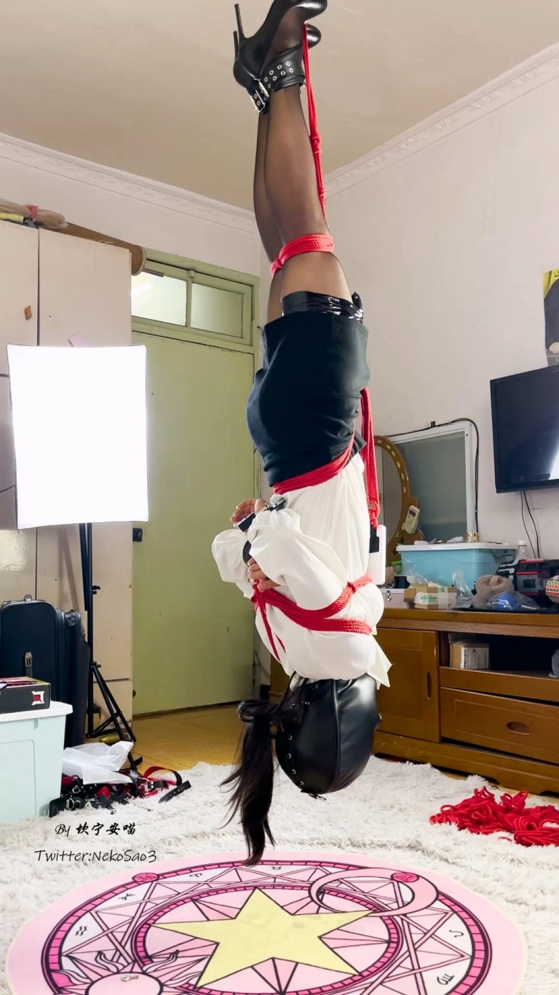脚踝使用了吊缚用的铐子,质地坚韧而且不会很勒(甚至很舒服),为了防止铐子因为重量过大崩开,在膝盖和胯部加了绳子进行辅助受力,上半身则是单独捆绑。