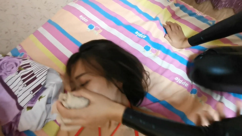 这时劫匪偷偷出来,并将迷药喷洒在白领穿过的袜子上。 白领在整理衣物并不知道身后的情况。劫匪突然从后面捂住了白领的口鼻,白领惊慌失措。在迷药的作用下白领渐渐体力不支,双脚无力的乱蹬。最终昏迷了过去。劫匪开始抚摸白领的身体,并贪婪的吻吸着白领的美足。并开始用丝袜全包了白领。 用白领的原味袜子堵塞嘴里。 将白领全部用丝袜束缚住。白领醒来开始拼命挣扎,但怎么也挣脱不了。劫匪在离开时将白领用袜子绑成丝袜,可怜的白领就这样被束缚着。。。