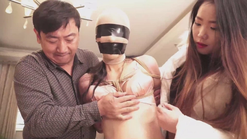 后给她戴上一副手铐。然后揭开绳子,然后把腿上的绳子解开换成绑在大腿根和腰部,然后用小绳子把手铐
