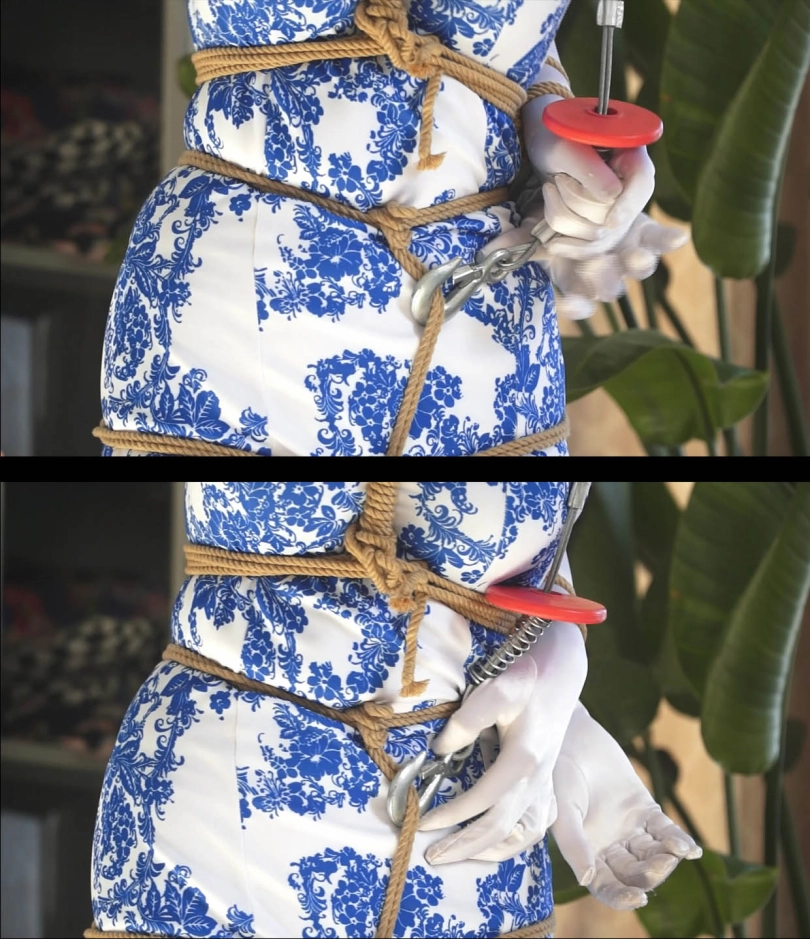 这是美女发现控制吊缚绳子的开关居然就在自己面前,不过开关吊在比自己身体高的地方,美女够不到,更何况这吊缚本来就让美女踮着丝袜小脚,根本站不稳。