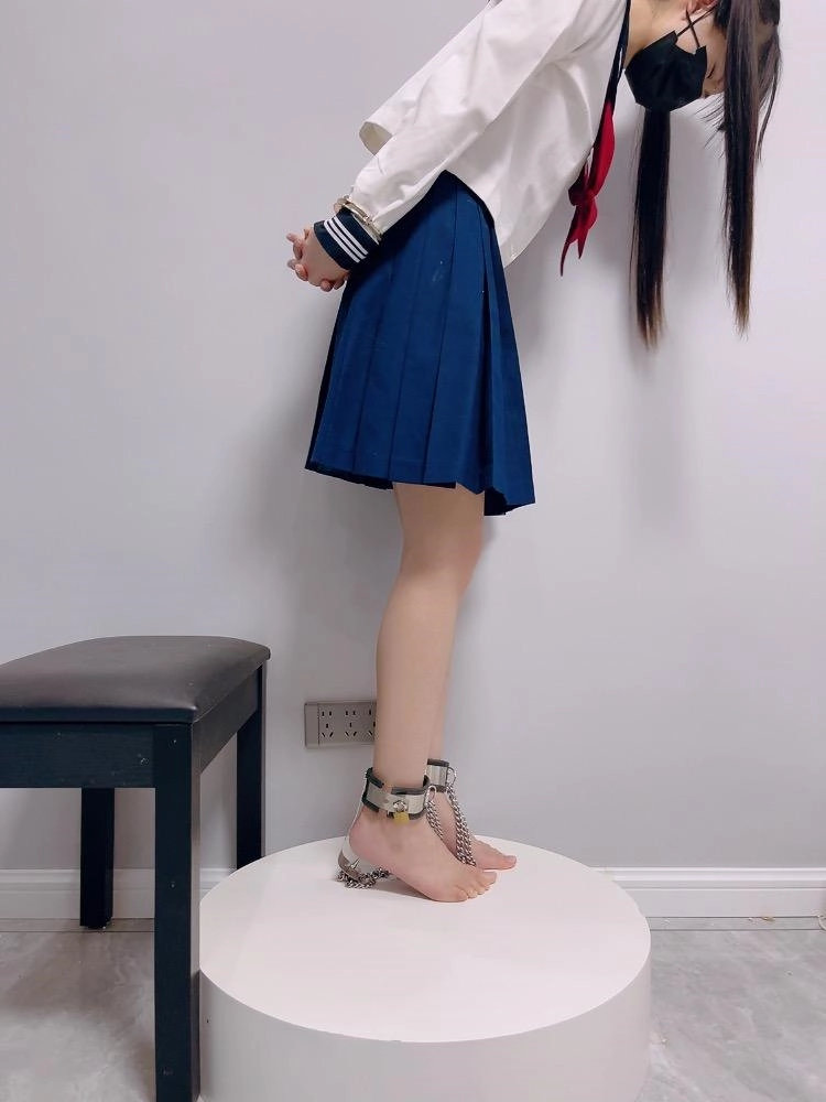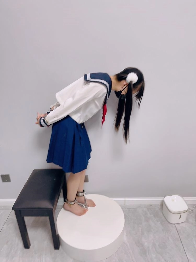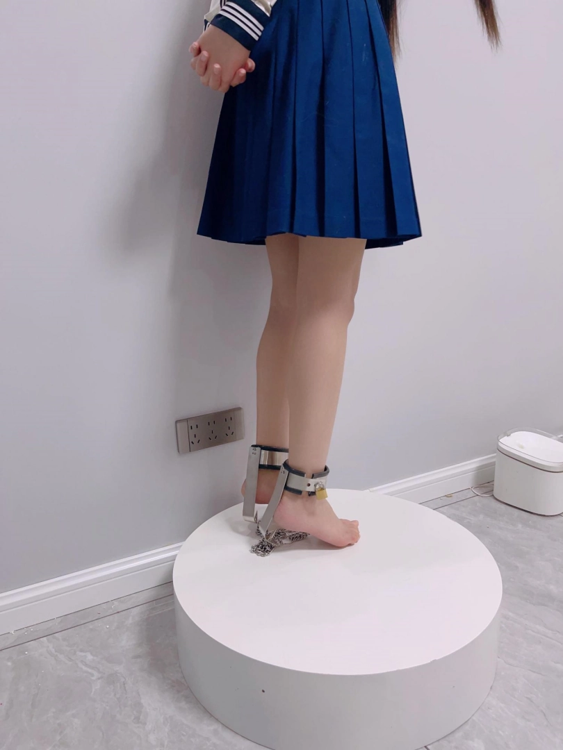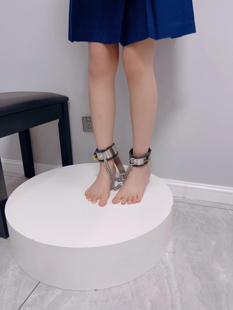 茶茶双手用最紧的板铐铐紧,且锁孔朝上。裸足小脚也穿上强制踮脚虐足器,强制在展示台上罚站。中间还把虐足脚镣的铁链互相锁到一起,只有10厘米左右移动空间,且全身重量都在脚趾上,虐的茶茶小腿颤抖,求饶。