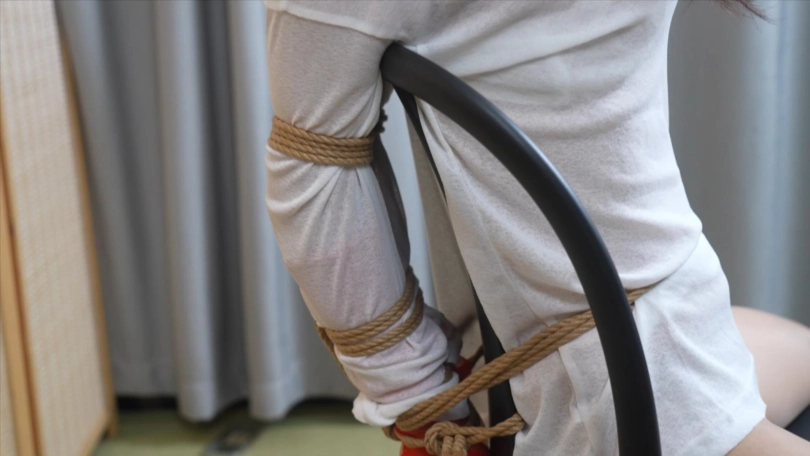 2,后手直臂卡在椅子的后背,双脚的脚腕绑在后椅子腿上,脚趾被拉扯到一边