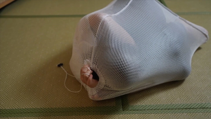 双手捆绑后装到洗衣袋里,套两层以后15分钟挣脱时间