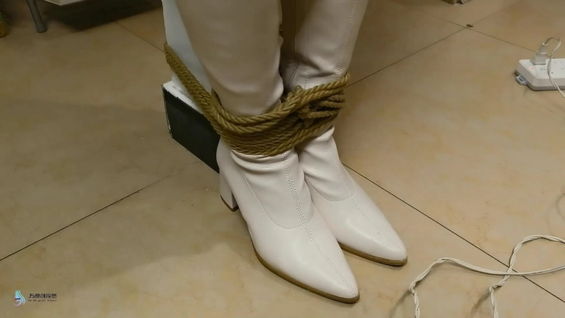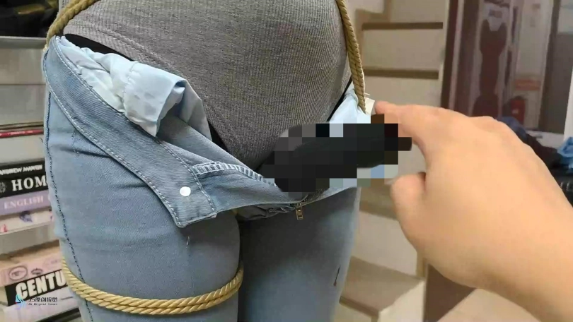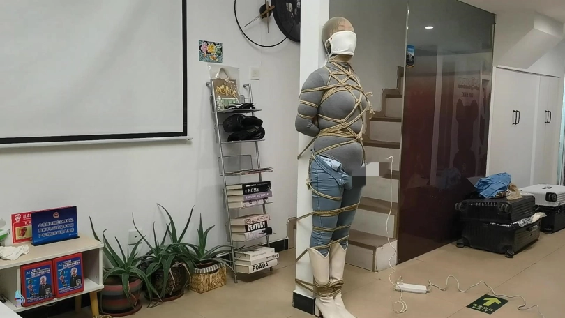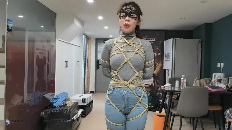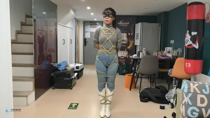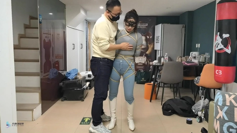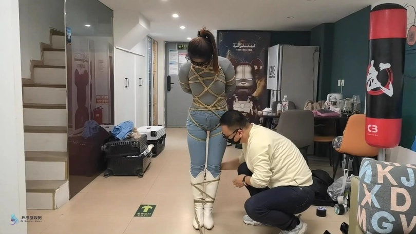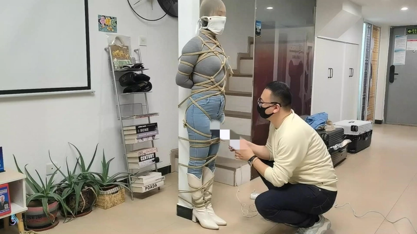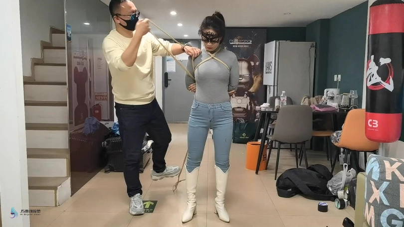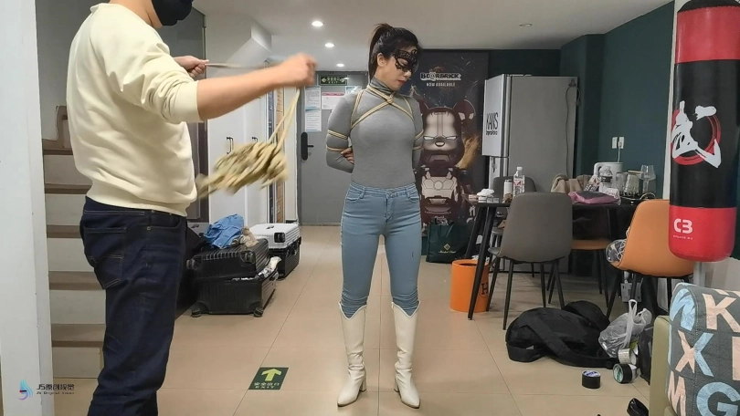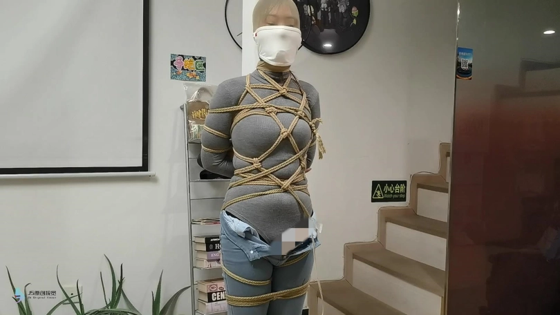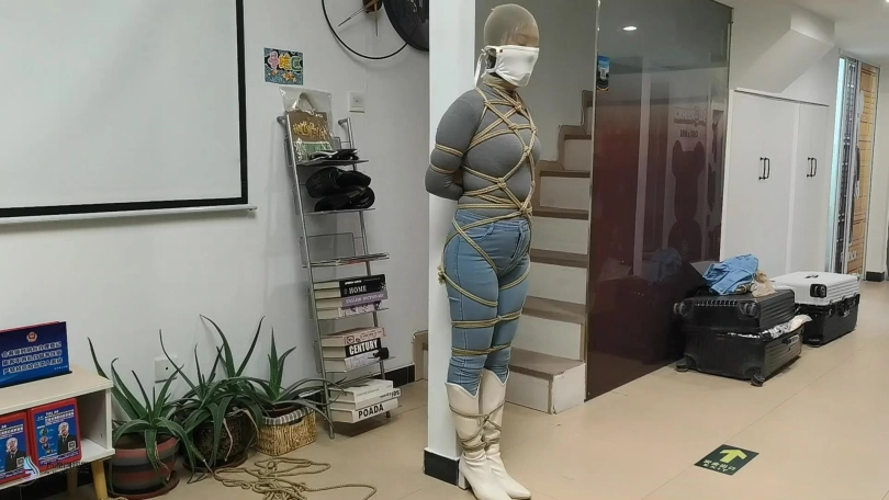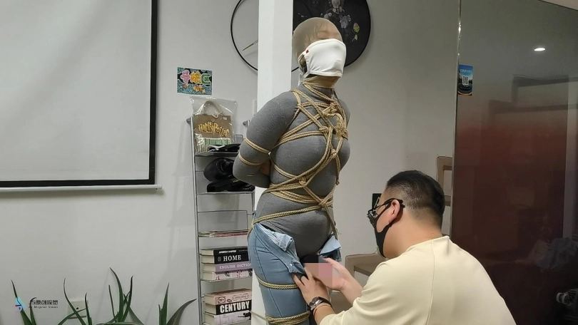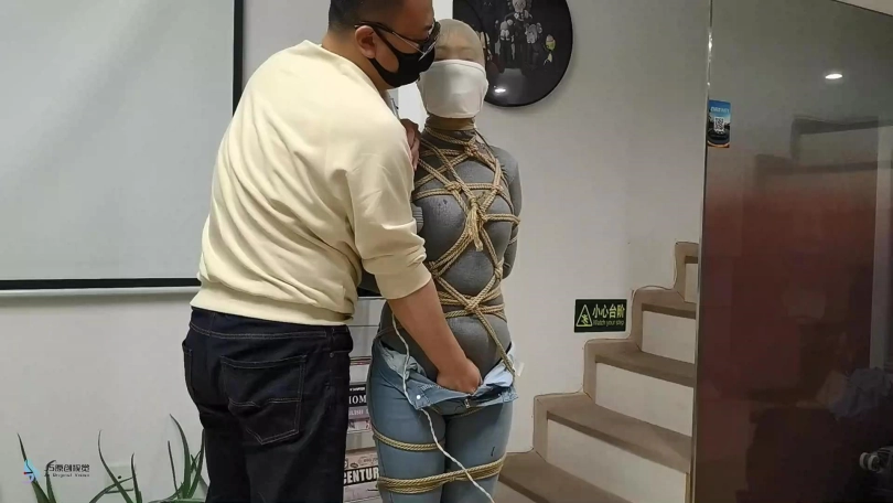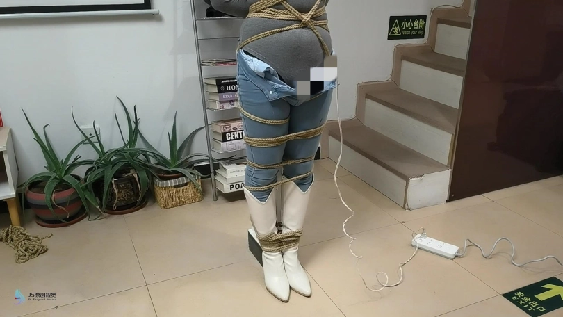 女人身穿牛仔裤和奶白色牛仔靴,用绳子将她全身密集的捆绑起来。嘴里塞着丝袜,在用丝袜头[X_X]在她头上,再用胶带缠绕她嘴巴,防止她吐出嘴里的丝袜。再给她戴上一个口罩,这样能限制她发出的声音。将她绑在柱子上固定好。开始抚摸她的胸部和裆部挑逗她,看火候差不多了,脱下点她的裤子,露出裆部,分别用两个棒棒轮着刺激着她的裆部,很快女人就释放,发出享受的呜呜声。