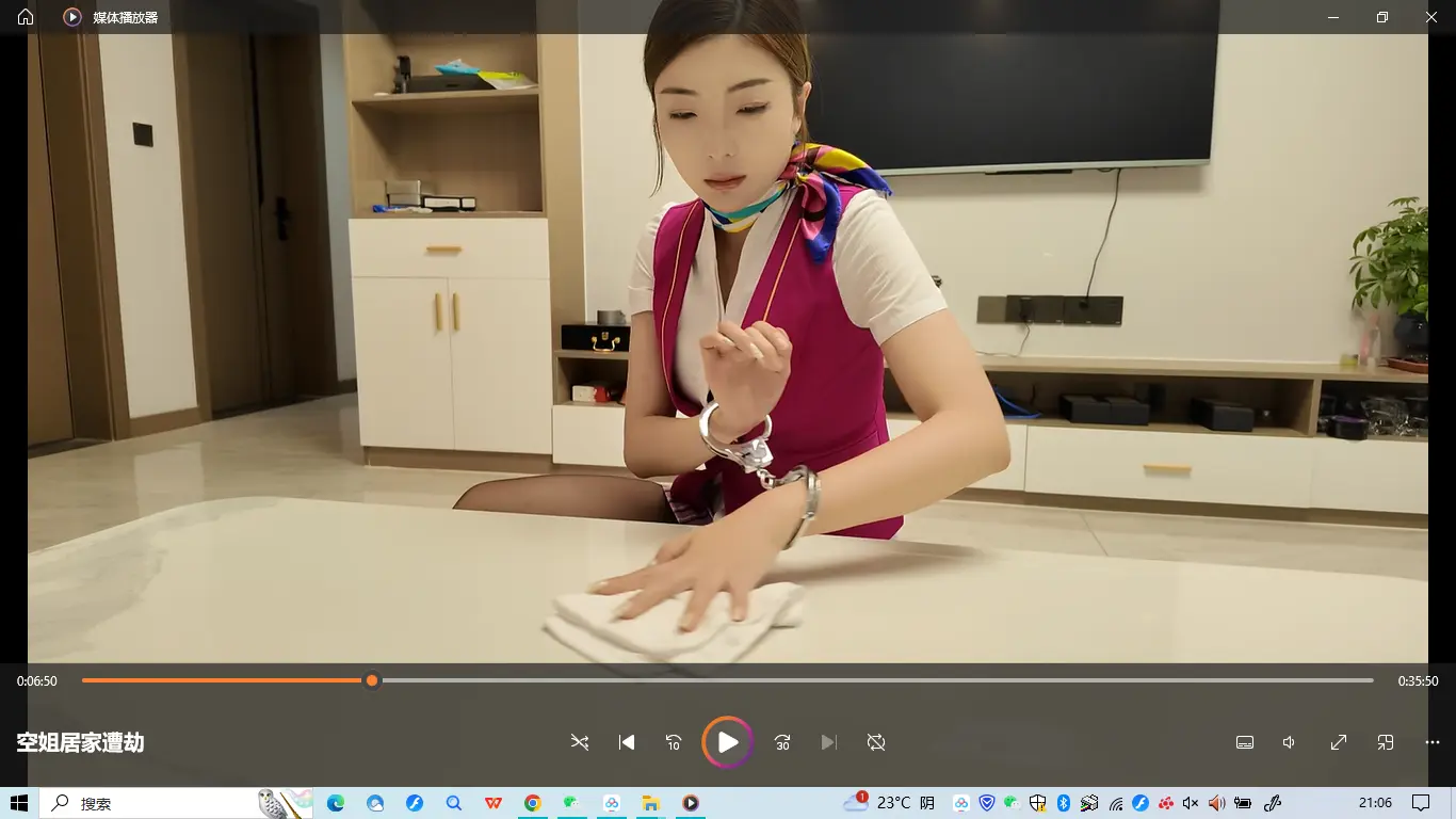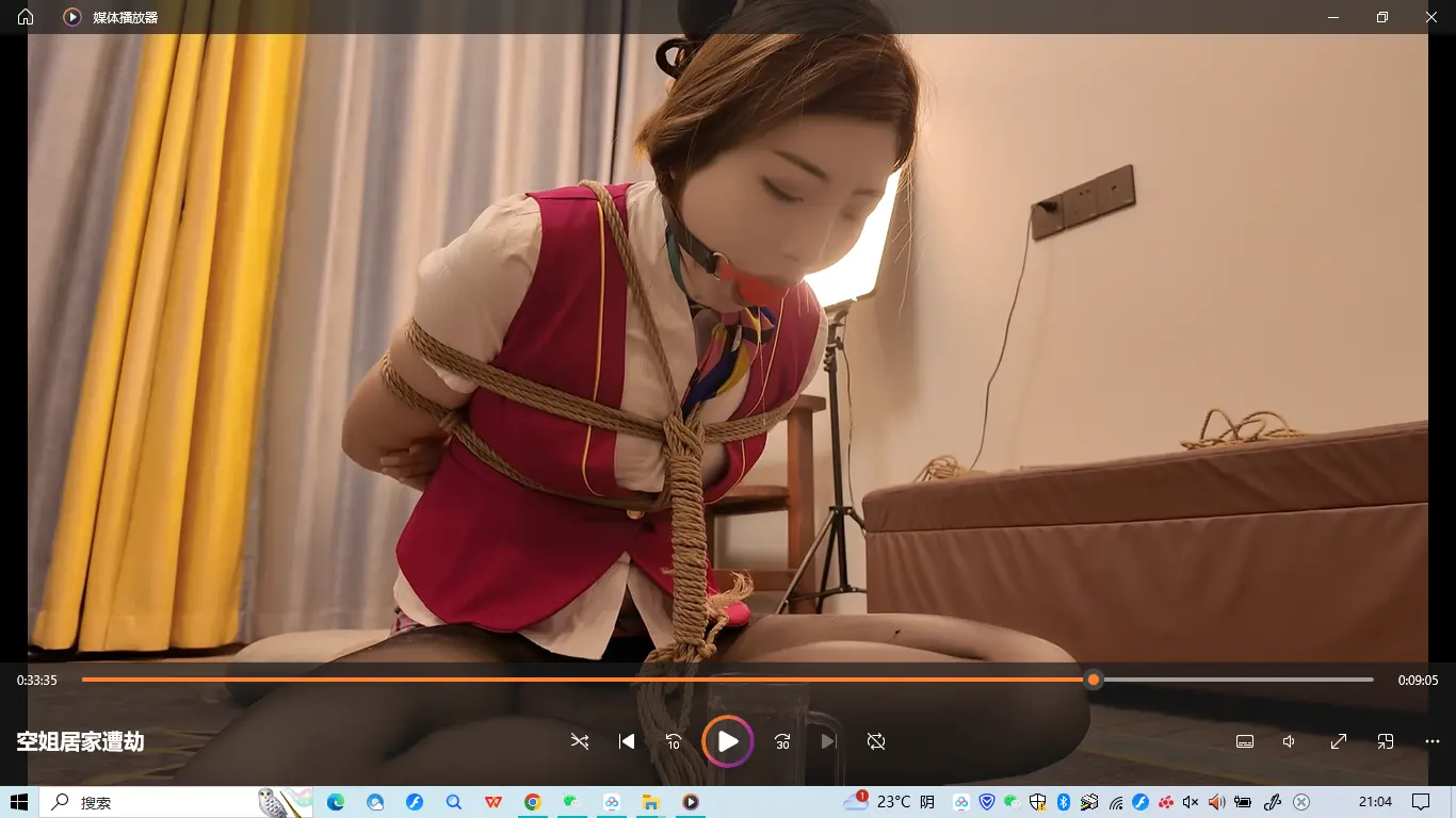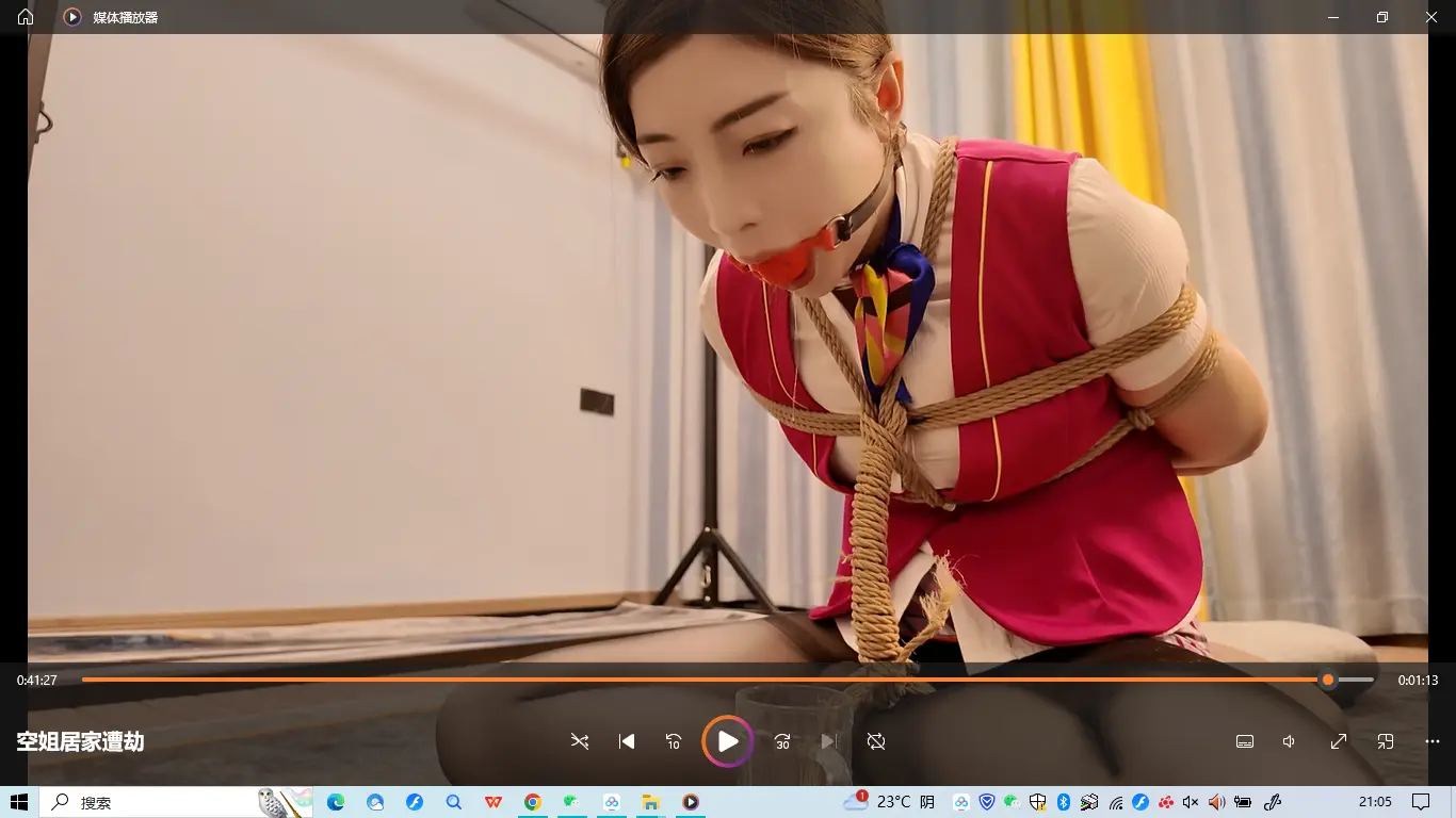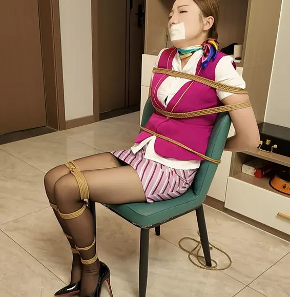 佳佳是一名空姐,这天休息在家,穿紫色裙装在沙发上玩手机,听到敲门声,以为是快递,结果开门闯进来一名蒙面人,上来捂晕抗到卧室里面驷马捆绑起来,用丝袜堵嘴,任何翻箱倒柜找财务,谁知道佳佳醒了之后拼命挣扎,竟然挣脱了捆绑,刚要跑出去,这个时候蒙面人进来,一把把佳佳推到在沙发上,用刀子威胁到,乖乖听话,要不然小心小名,把你这套空姐制服换上,让我也尝尝空姐服务的滋味,佳佳被逼无奈,换上空姐制服,被迫带上手铐打扫卫生,又被绑到椅子上面折磨,最后被绑成海老缚收集口水,水杯收集不满不放开