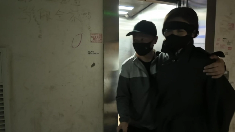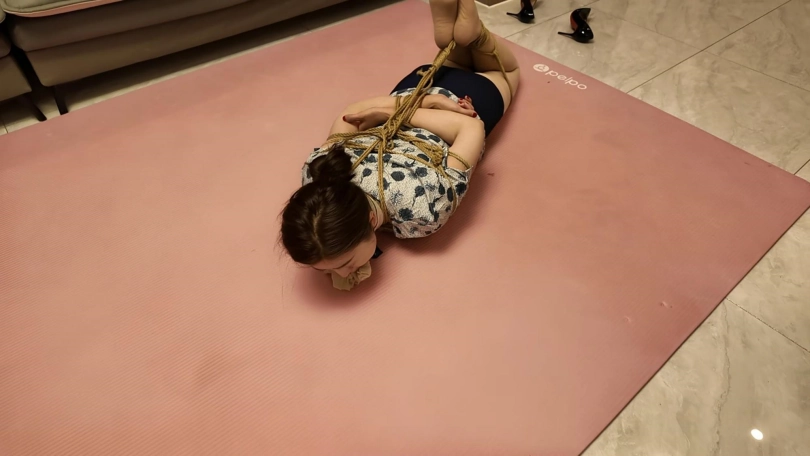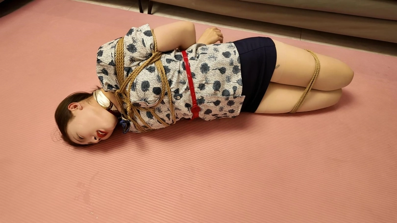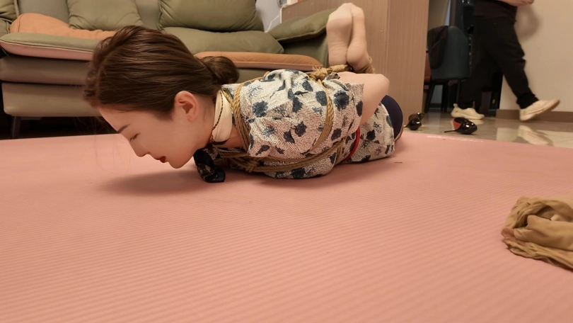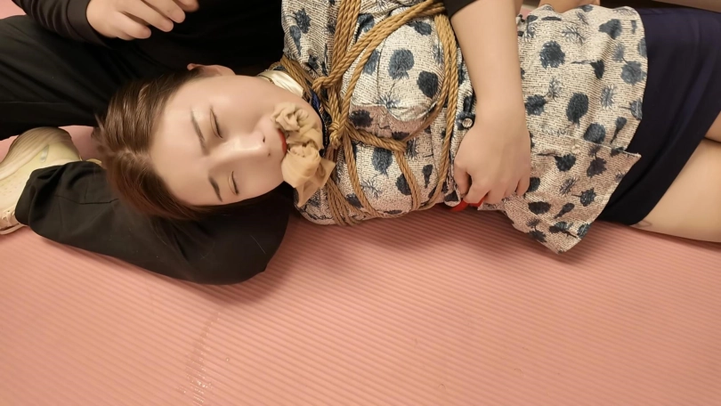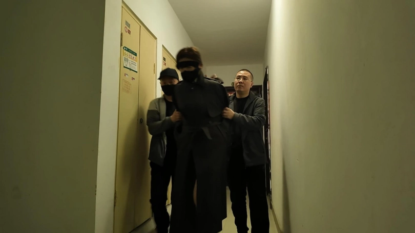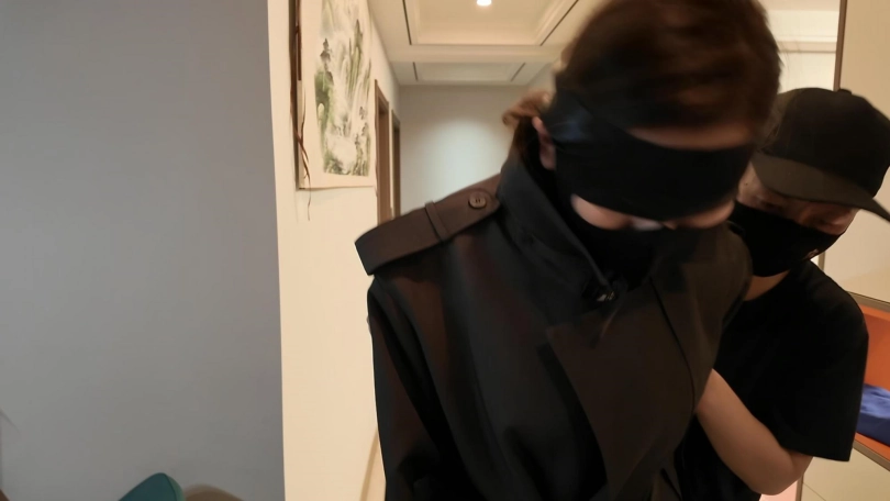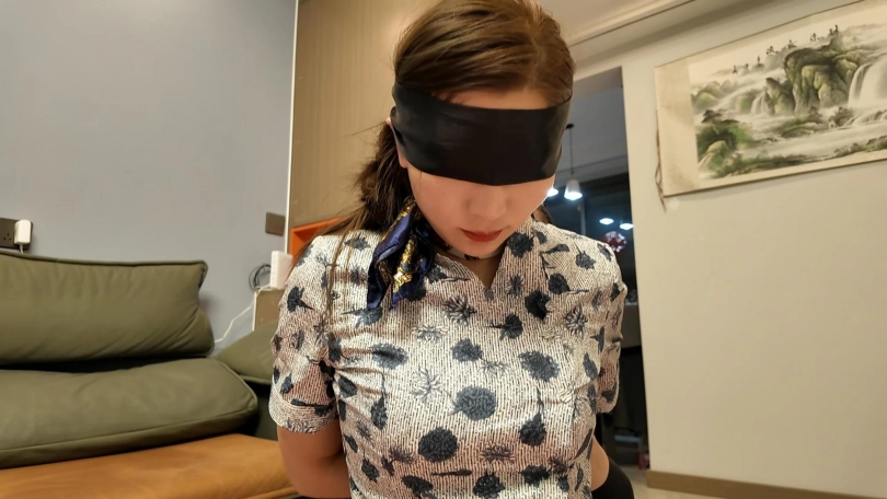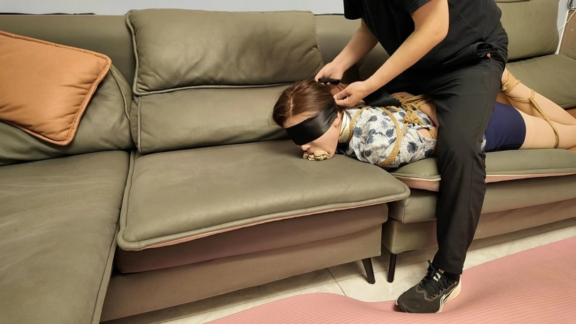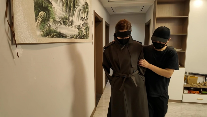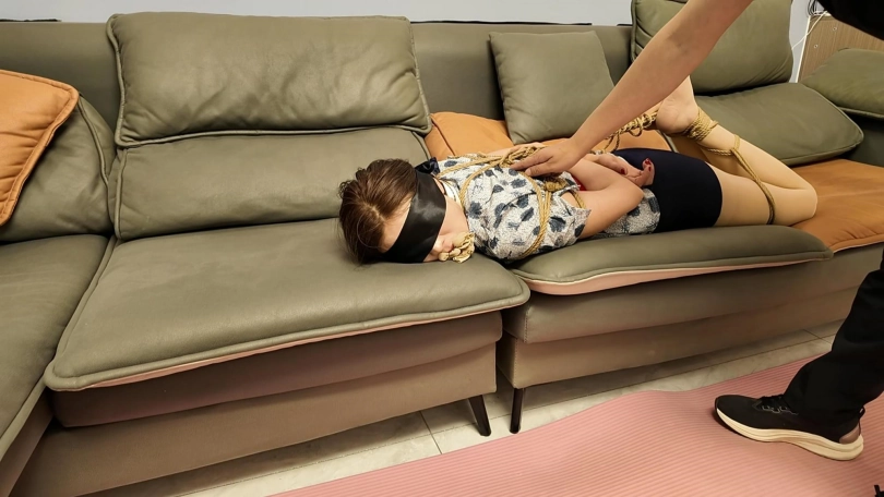 空姐佳佳下班在家沙发上休息,被两名歹徒强行绑起来勒索,逼迫说出银行密码,丝袜堵嘴,蒙眼,最后胶带封嘴,绑上股绳,捆绑双手,带上口罩,外面穿上大衣,强行带到秘密处所进行下一步调叫