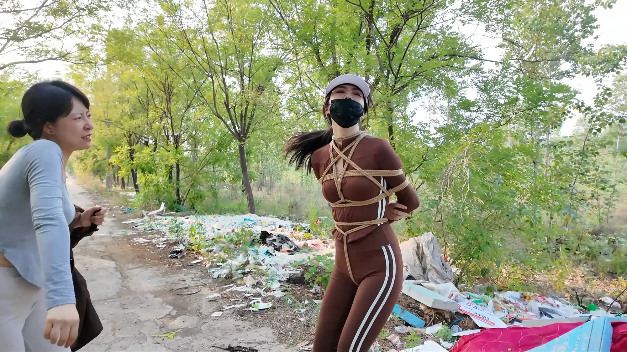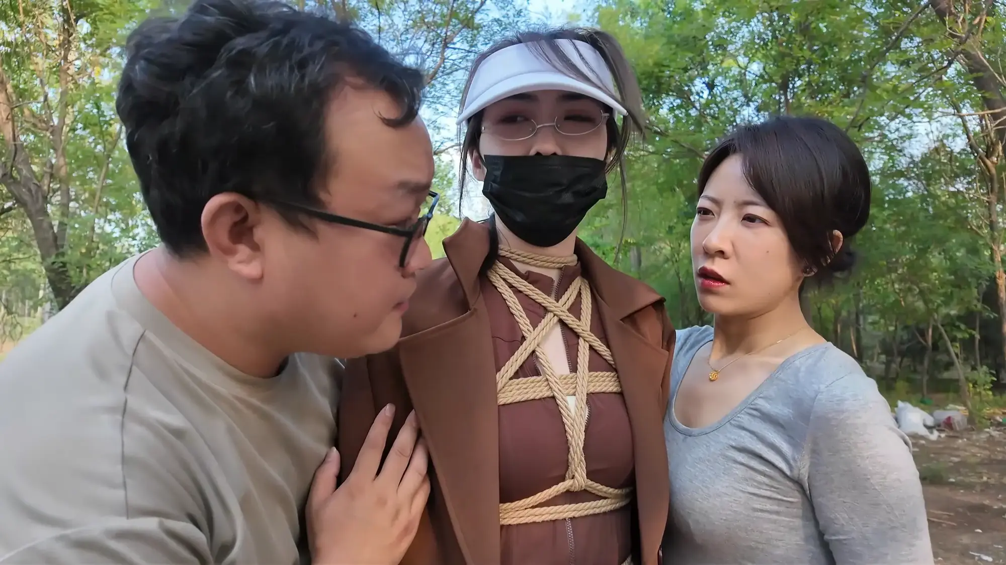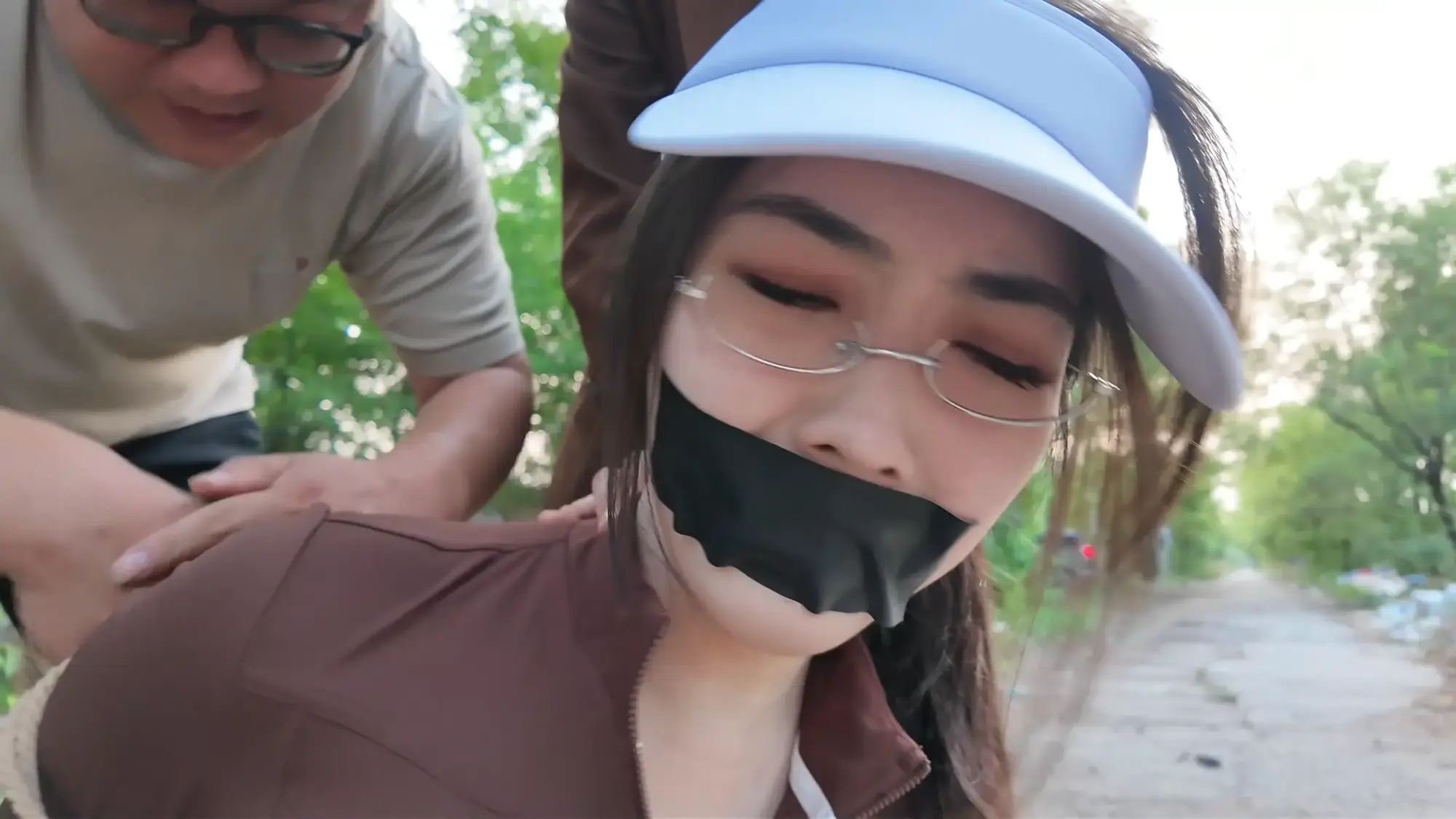 男人将汽车开到了一处空地,雨诺一直在看手机没有留意路线,她询问女人这是什么地方,女人二话不说掐住了她的脖子,前座的男人下车也上前拉扯她的衣服,慌乱之中雨诺一把推开男人,朝着远处逃跑,女人让男人先追自己在后座掏出了绳子也追了上去。雨诺边跑边喊救命,不慎被石头绊倒,两人上前控制住雨诺,女人拿胶布封嘴,男人将雨诺双手反扭,拿绳子把雨诺严严实实捆绑起来。绝望的雨诺被男人一把拽起,身边的女人拍打着她的屁股表示这次抓到的肉货身材真不错,为了保险起见女人脱下自己的外衣遮住雨诺身上的绳子,并给雨诺戴上了口罩并压着她向车走去。