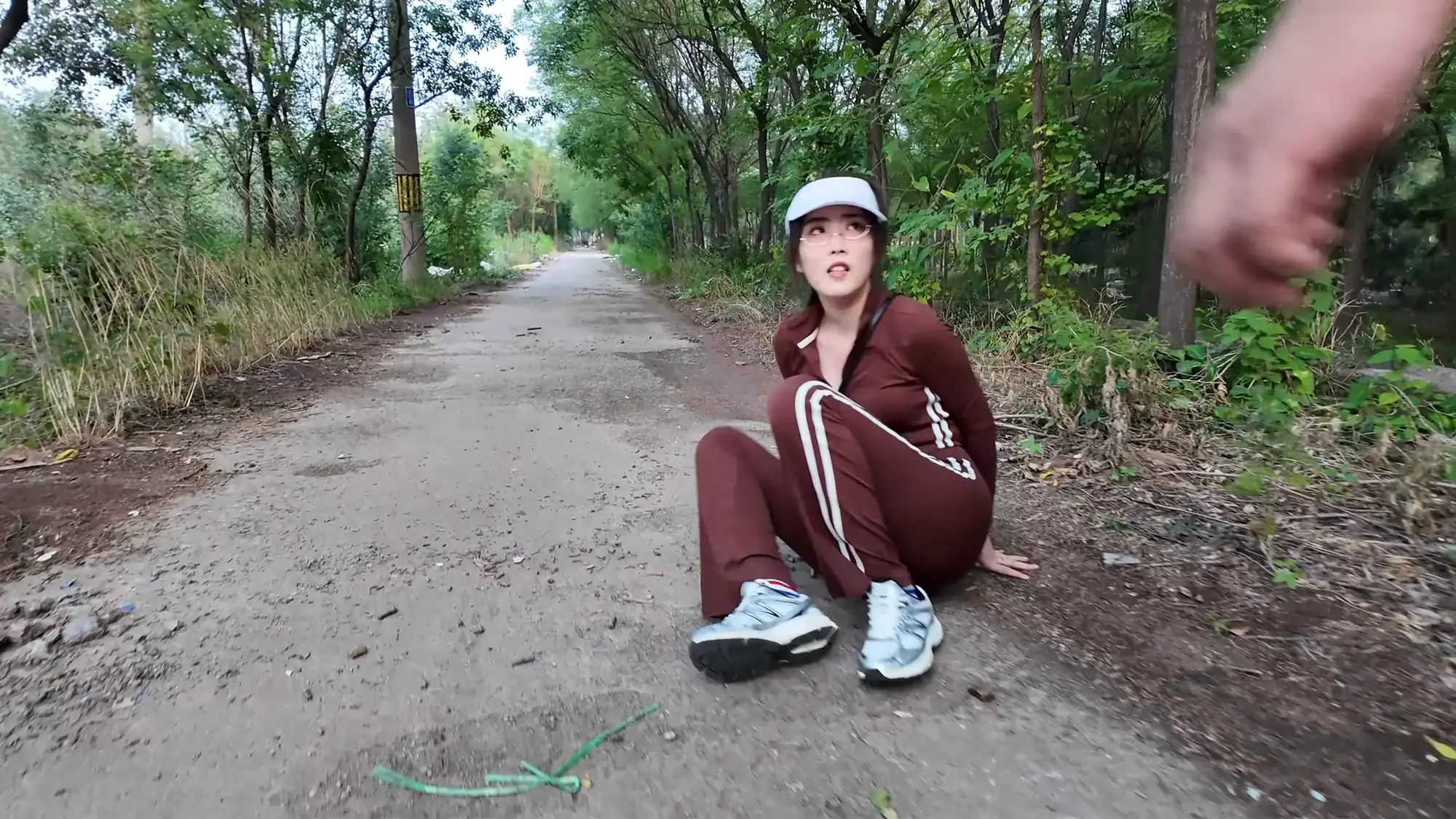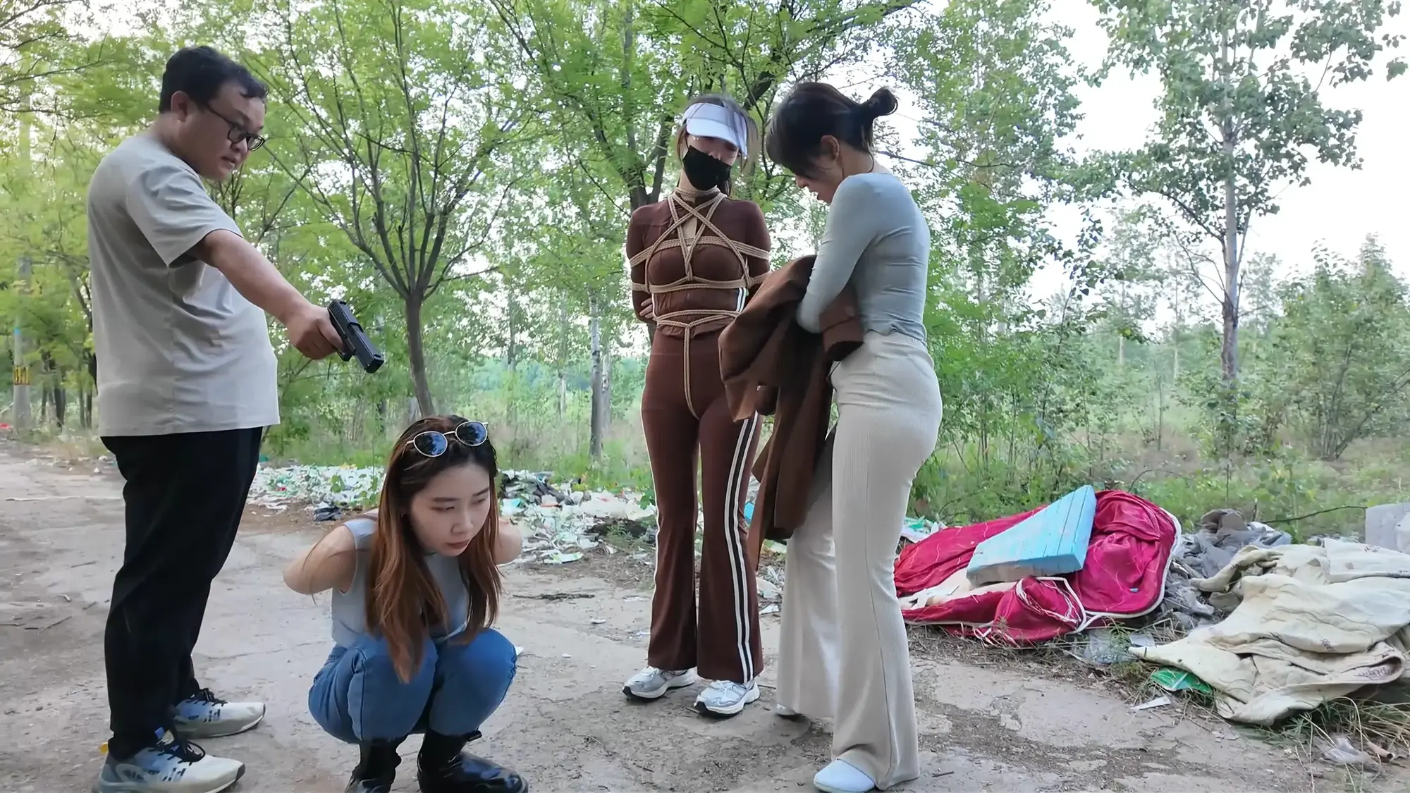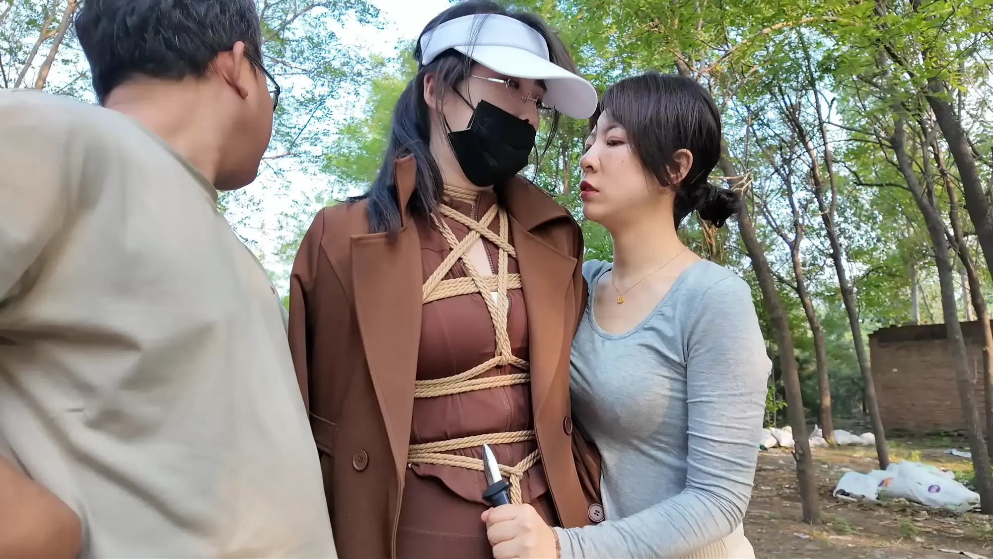男人将汽车开到了一处空地,雨诺一直在看手机没有留意路线,她询问女人这是什么地方,女人二话不说掐住了她的脖子,前座的男人下车也上前拉扯她的衣服,慌乱之中雨诺一把推开男人,朝着远处逃跑,女人让男人先追自己在后座掏出了绳子也追了上去。雨诺边跑边喊救命,不慎被石头绊倒,两人上前控制住雨诺,女人拿胶布封嘴,男人将雨诺双手反扭,拿绳子把雨诺严严实实捆绑起来。绝望的雨诺被男人一把拽起,身边的女人拍打着她的屁股表示这次抓到的肉货身材真不错,为了保险起见女人脱下自己的外衣遮住雨诺身上的绳子,并给雨诺戴上了口罩并压着她向车走去。